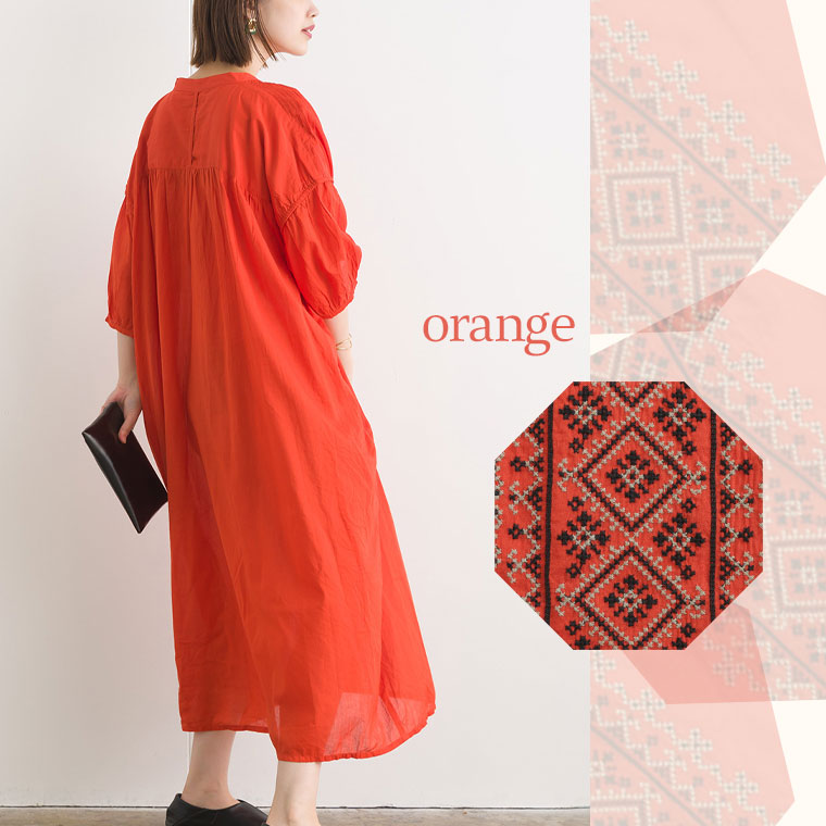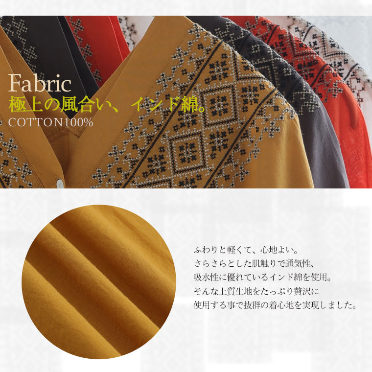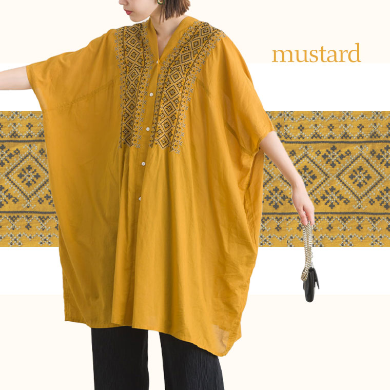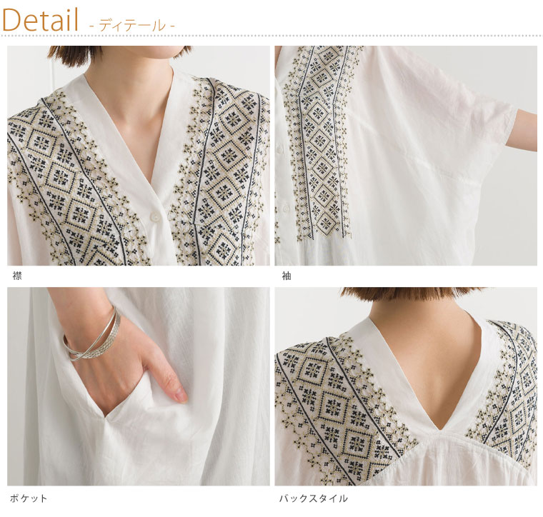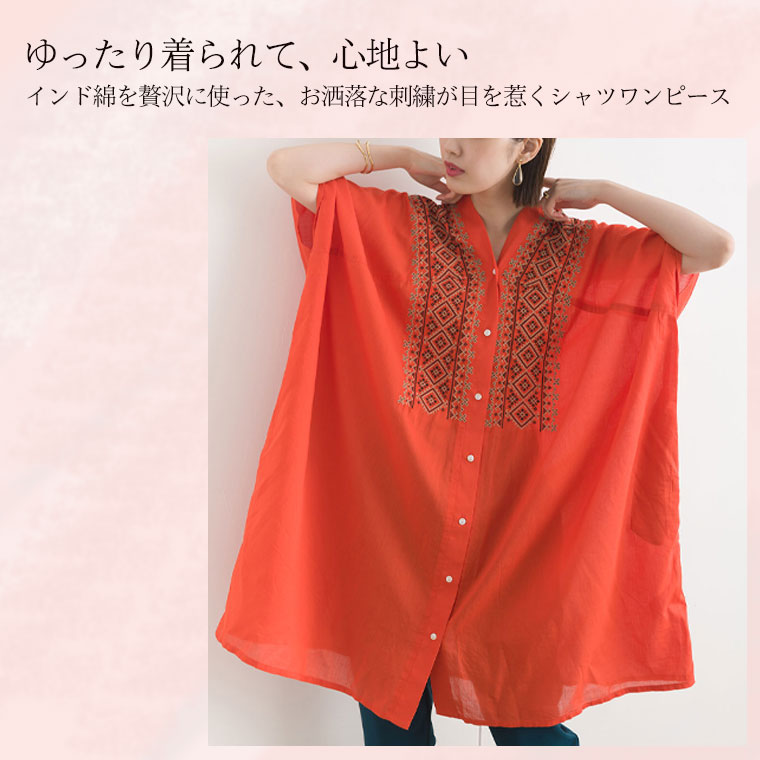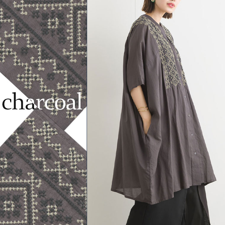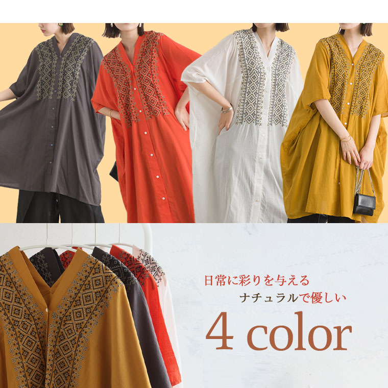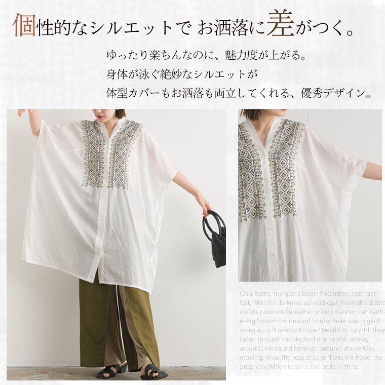 個性的なシルエットとお洒落な刺繍が目を引くシャツワンピース