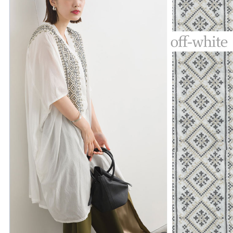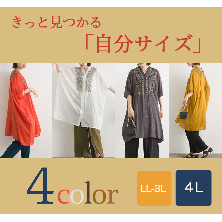 4L オフホワイトを購入しました。 刺繍の柄がとてもオシャレです。 風通しがよく、とても軽い生地で着心地が良いです。体型カバーもしてくれます。 ポケットが左右にあるのも、外出時に便利です。 暑い季節にヘビロテしそうです。