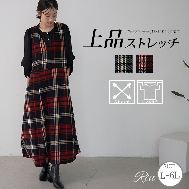 ジャンスカ LL 3L 4L 5L 6L 秋 秋物 秋服 冬 冬物 冬服 ぽっちゃり ゆったり リン きれいめ Rin 大人が頼れる チェック柄 タック フレアー ジャンパースカート カットソー オフィス 大人 ビジネス 通勤 ママ | 大きいサイズの通販ならハッピーマリリン
