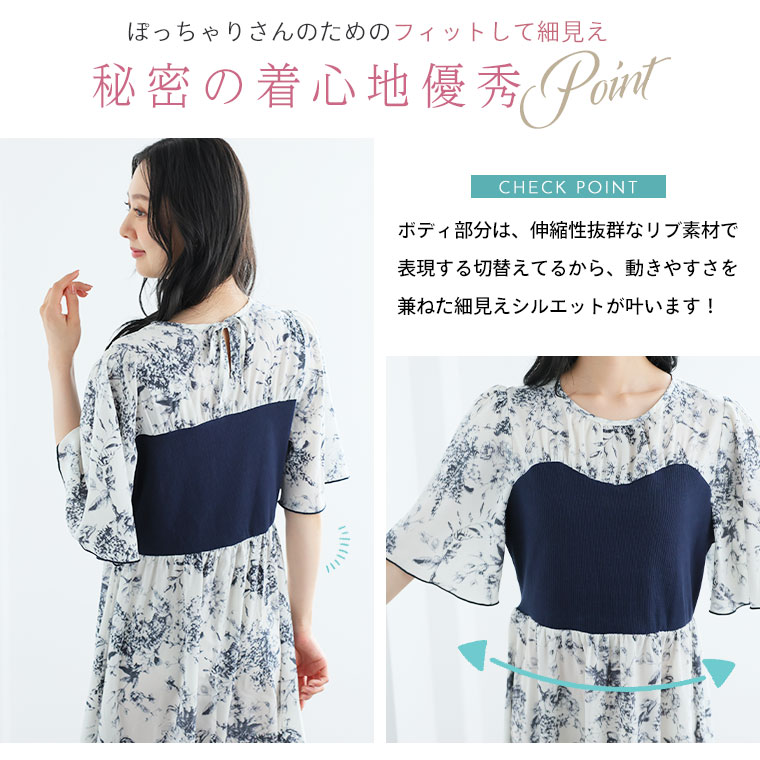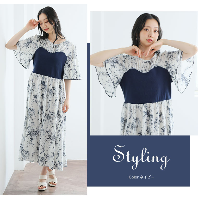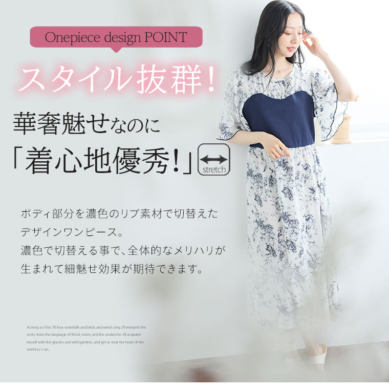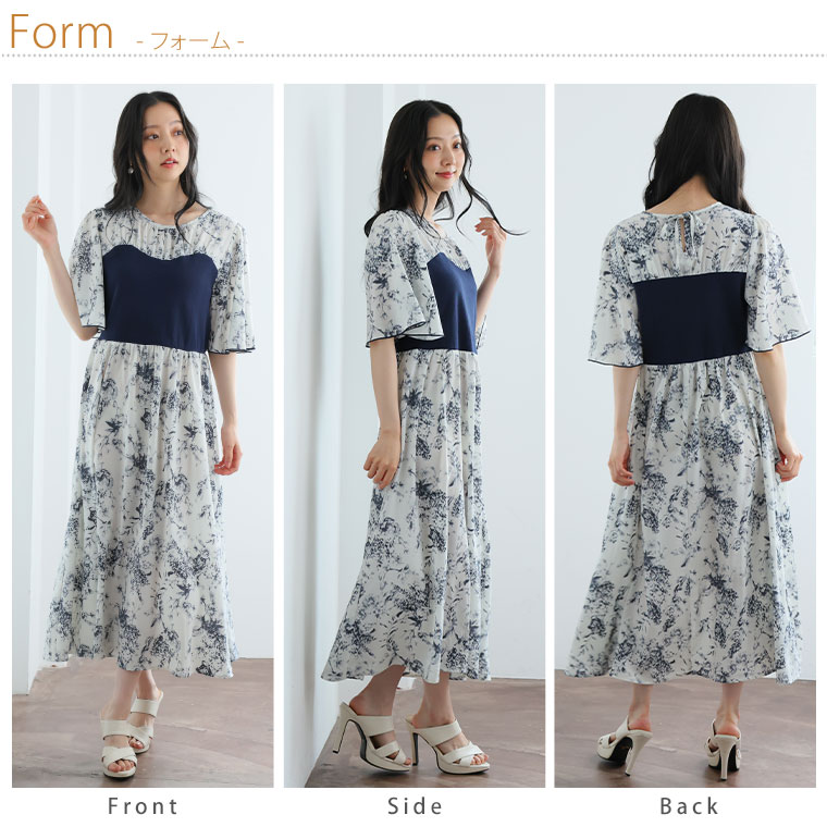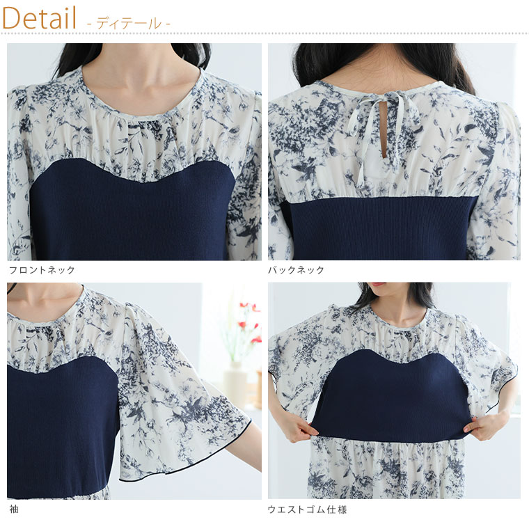 花柄プリントで華やか!ウエストリブフレア袖ワンピース