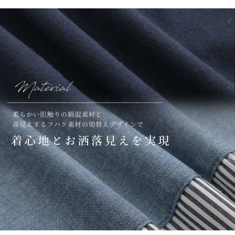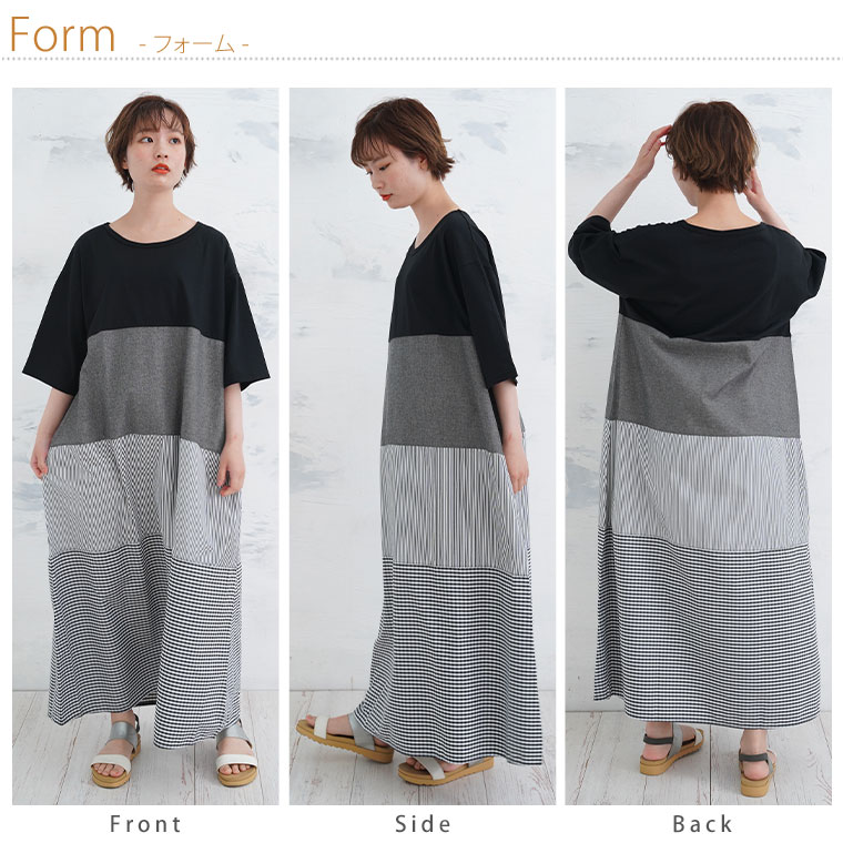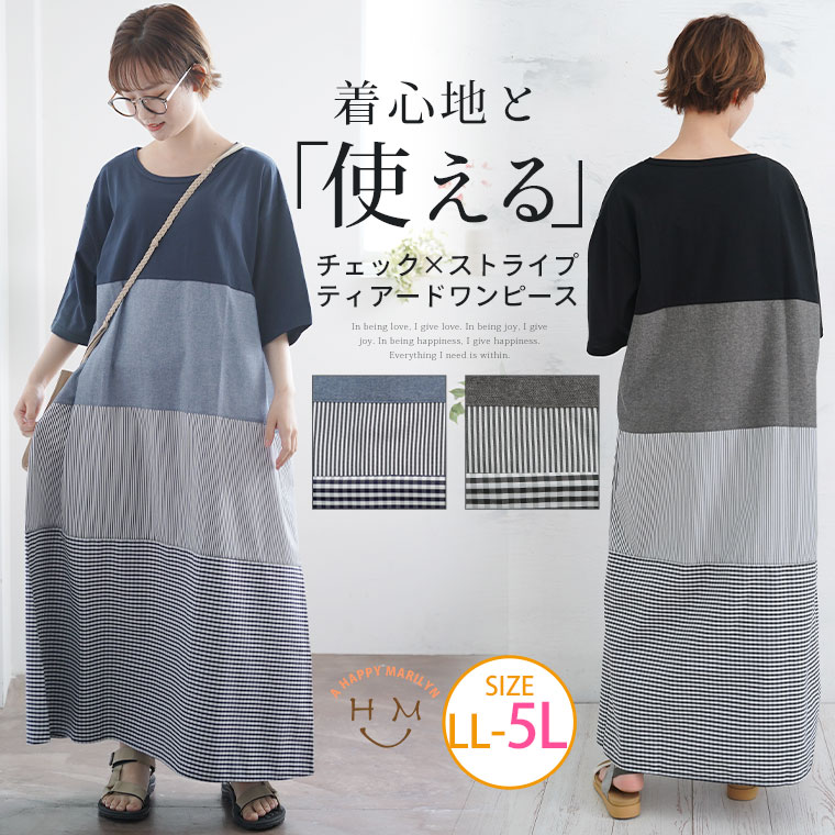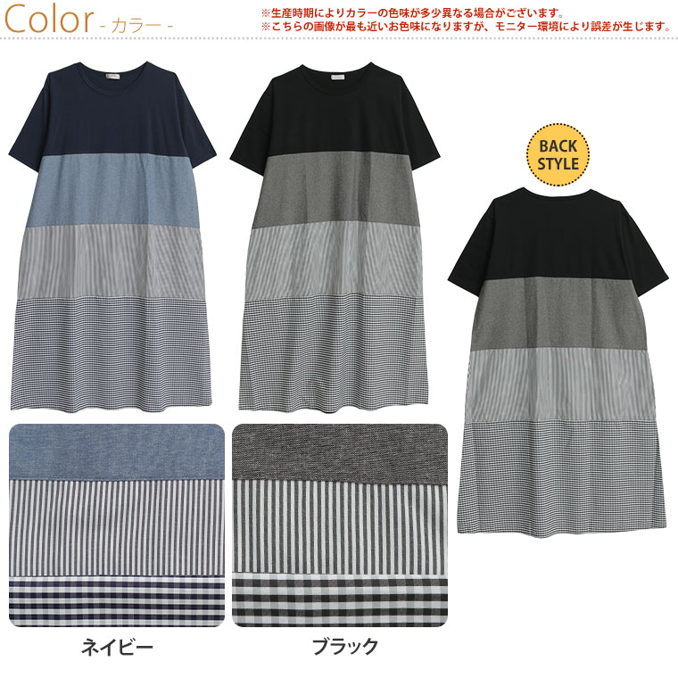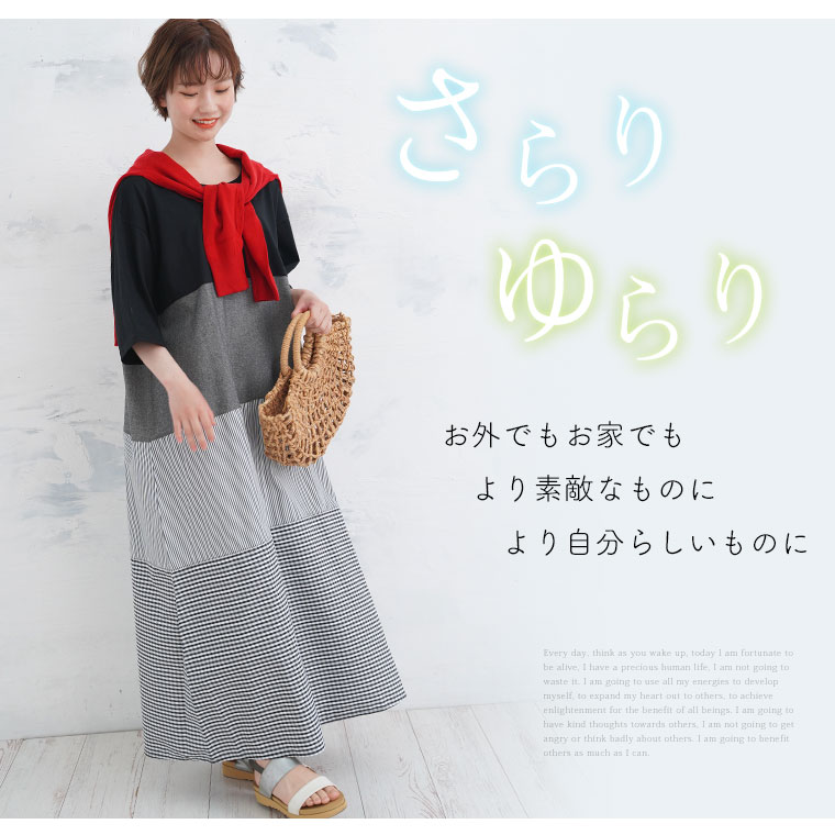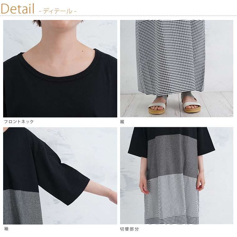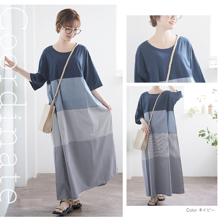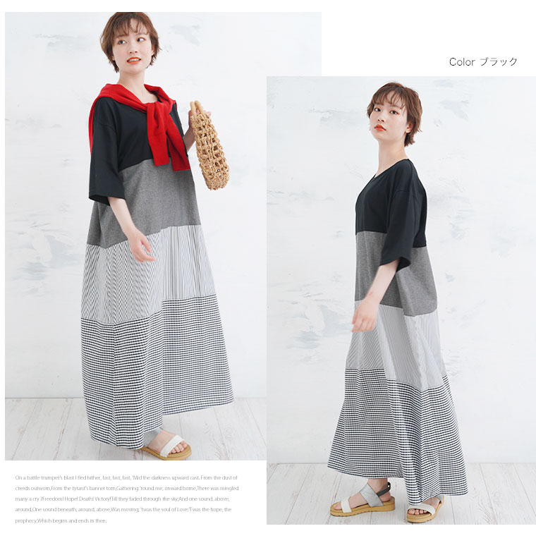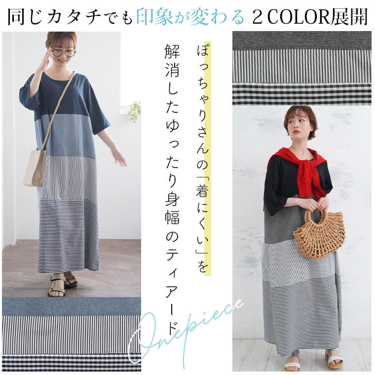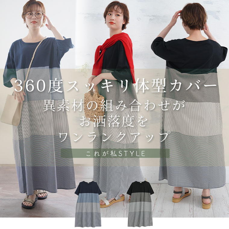異素材切り替えが大人かわいい チェック×ストライプワンピ
