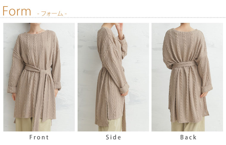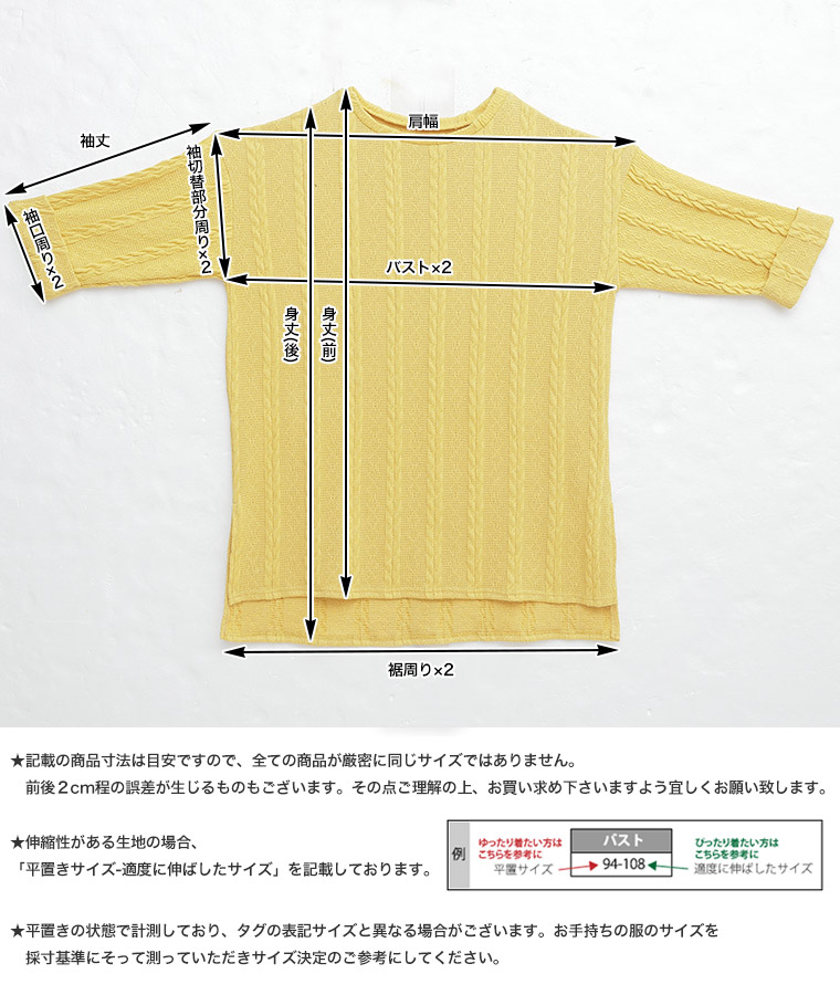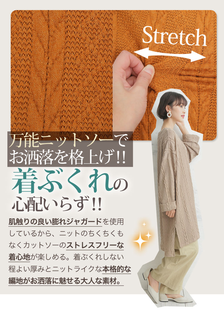 ニットに見えるカットソーなので着ぶくれすることなくスッキリと着用できました。ニットだと暑すぎるという方におススメです。チュニック丈でお尻もすっぽりと隠れる膝上8cmの丈感でした。袖丈が短めで、レイヤードも楽しめるし、ロングシーズン着回せますね。ゆったりと着用できました。
