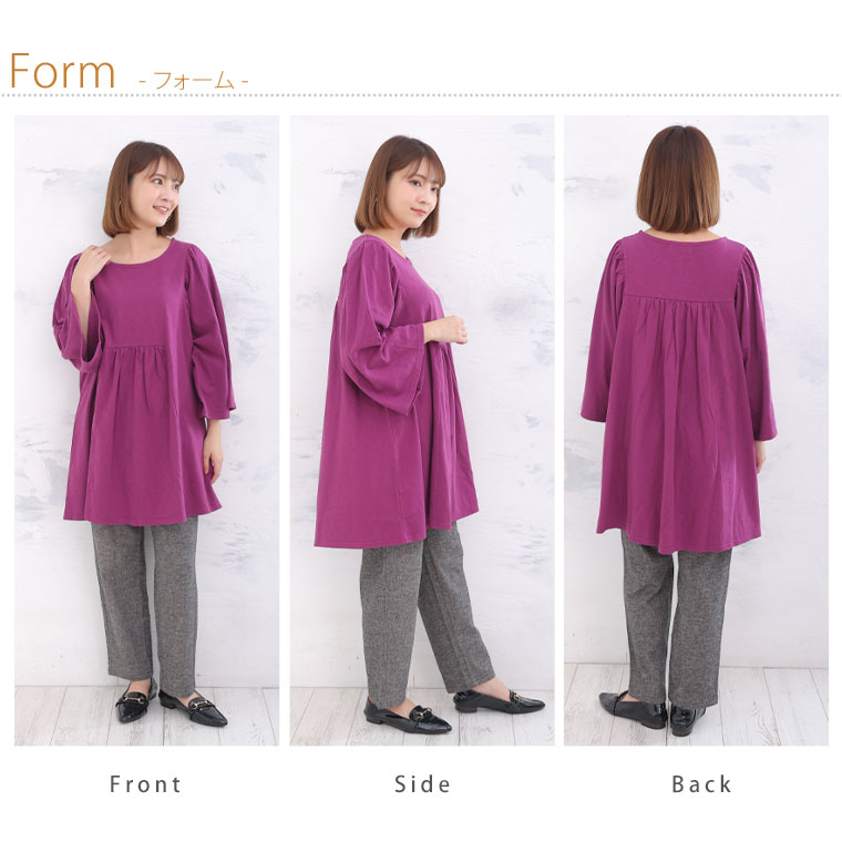 生地は若干厚いに近いですがこのくらいだとインとカーデとかで冬もOK.だとは思いますが後ろのギャザーもいい。低身長なのでひざが隠れますし袖丈も長袖丈で手首隠れます。でレイヤードもいい感じの丈でデザインもいいです。着やすいし綿100もいい。綿生地はこなれるのに時間かかるから早くなれるといいな。