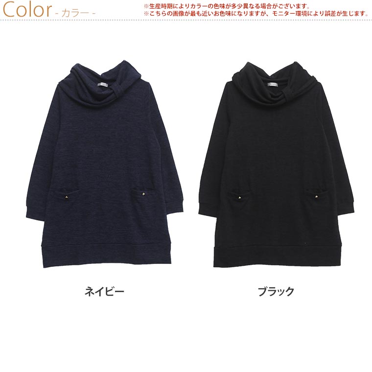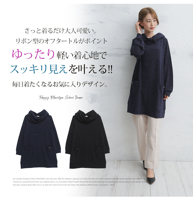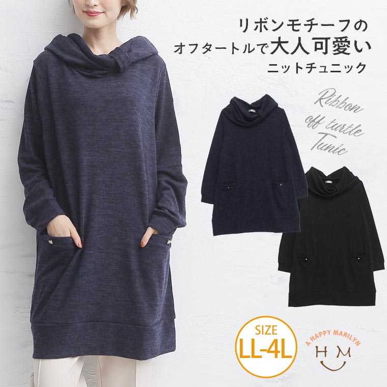 トップス チュニック LL 3L 4L 秋 秋物 秋服 冬 冬物 冬服 ぽっちゃり ゆったり お腹 太もも 胸周り 二の腕カバー お尻 腰周り 長袖 かわいい リボン オフタートル ポケット付き チュニック