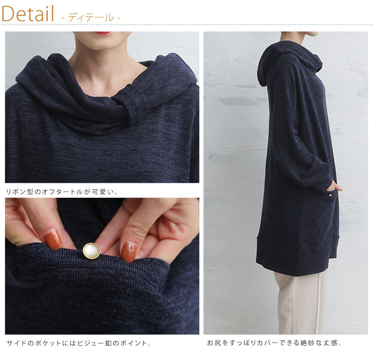 個性的なネックデザインがおしゃれ♪リボンオフタートルポケット付きチュニック