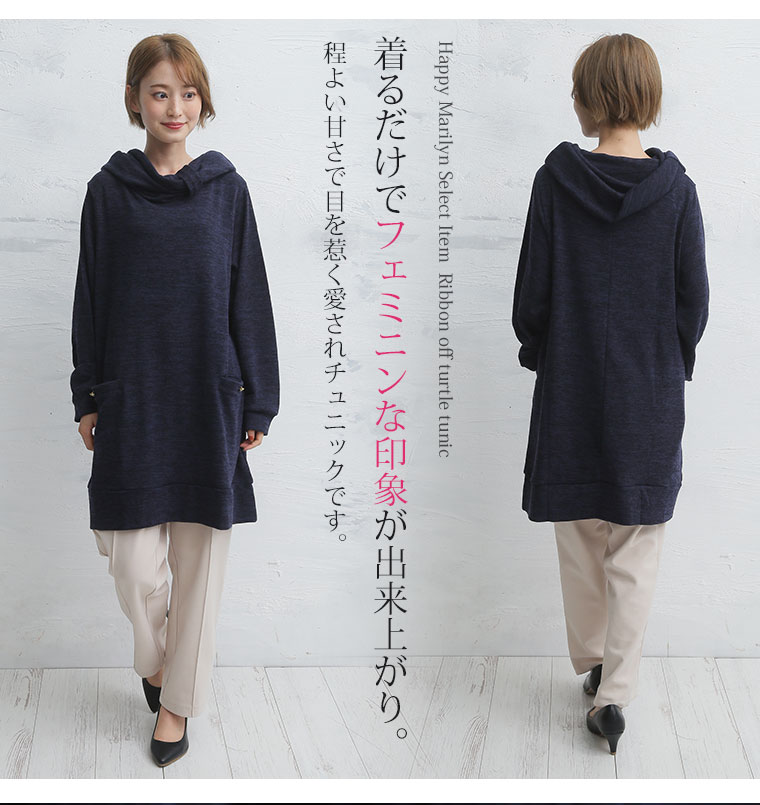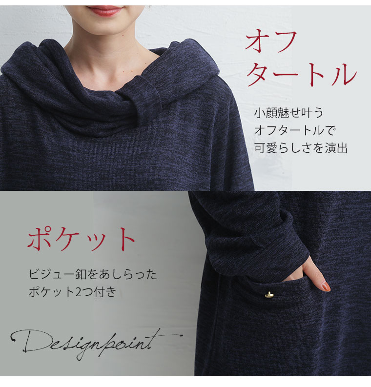 5. 大きいサイズ リボン オフタートル ポケット付き チュニック