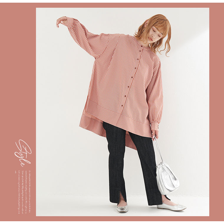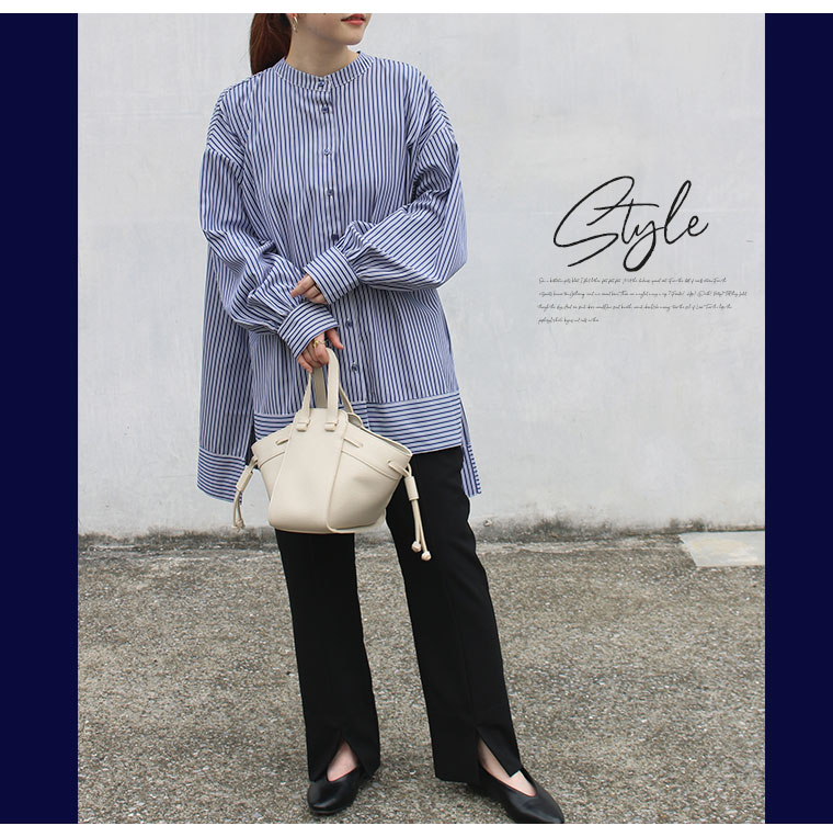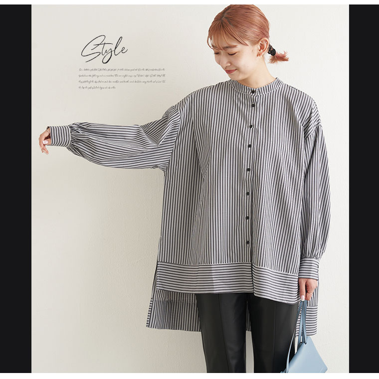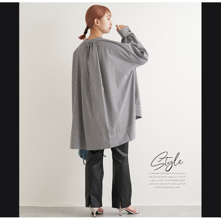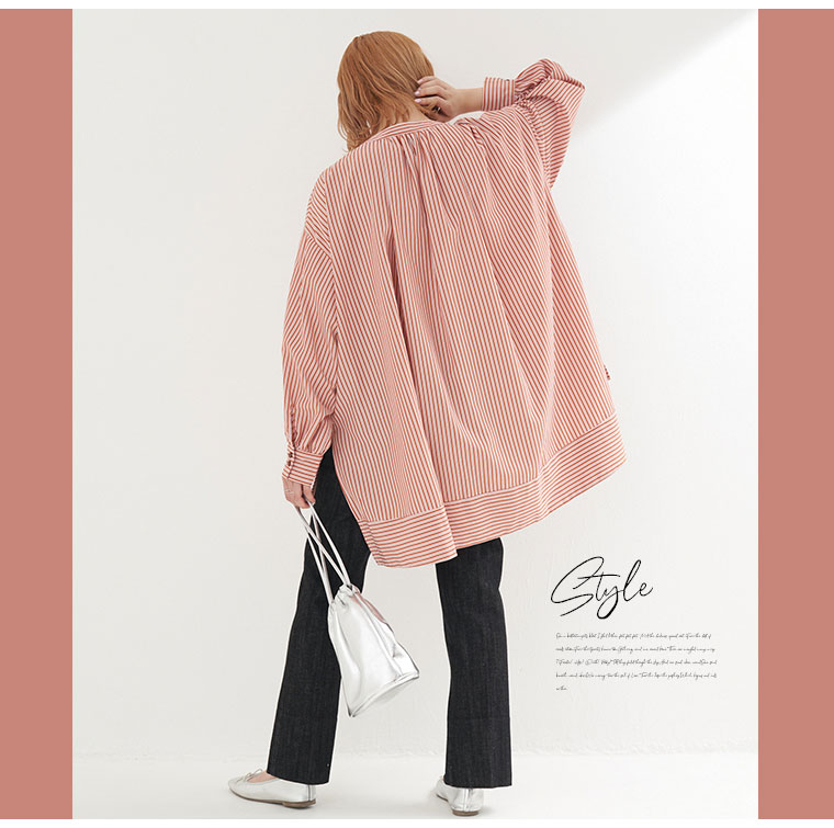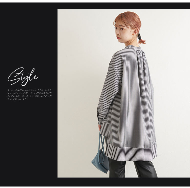 少し厚手のワイシャツのような生地でキレイめ、高見えします。 洗濯すると硬くて強めのシワが出来るのでアイロンがけは必須です。 丈が広がっているので、胸周りにボリュームがあるとそのまま広がるシルエットです。