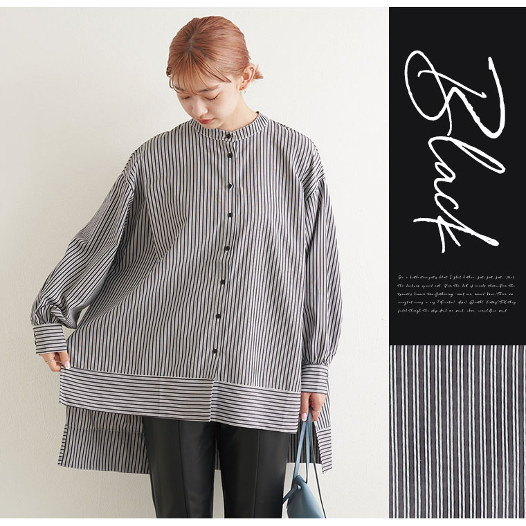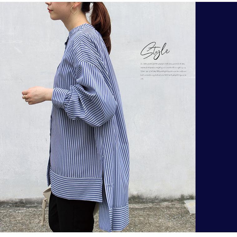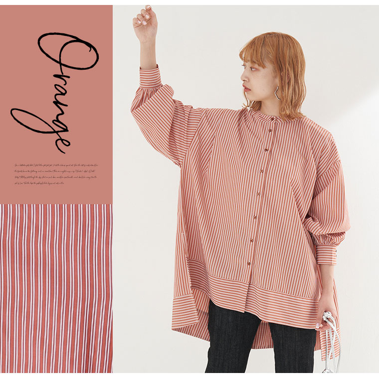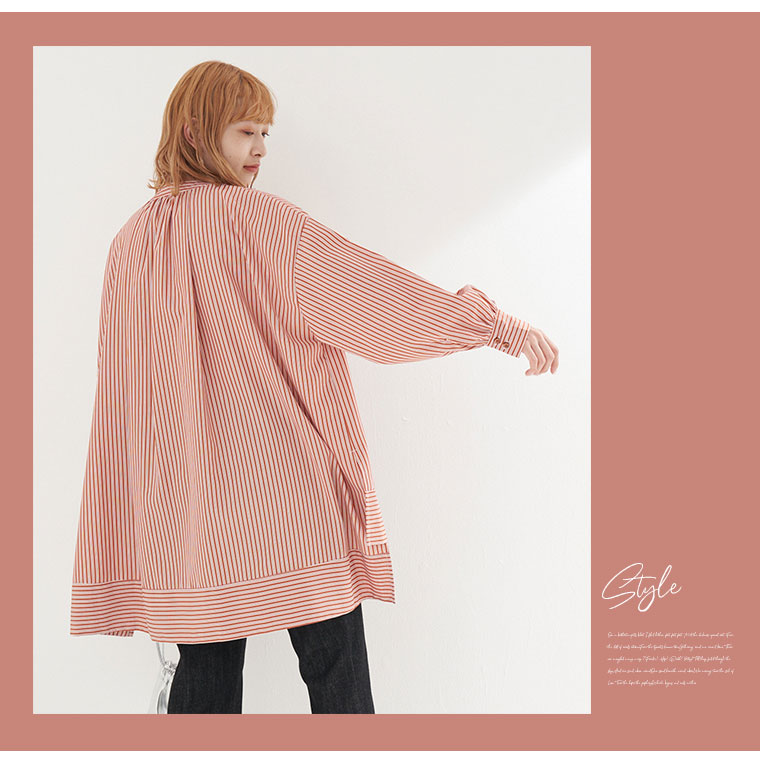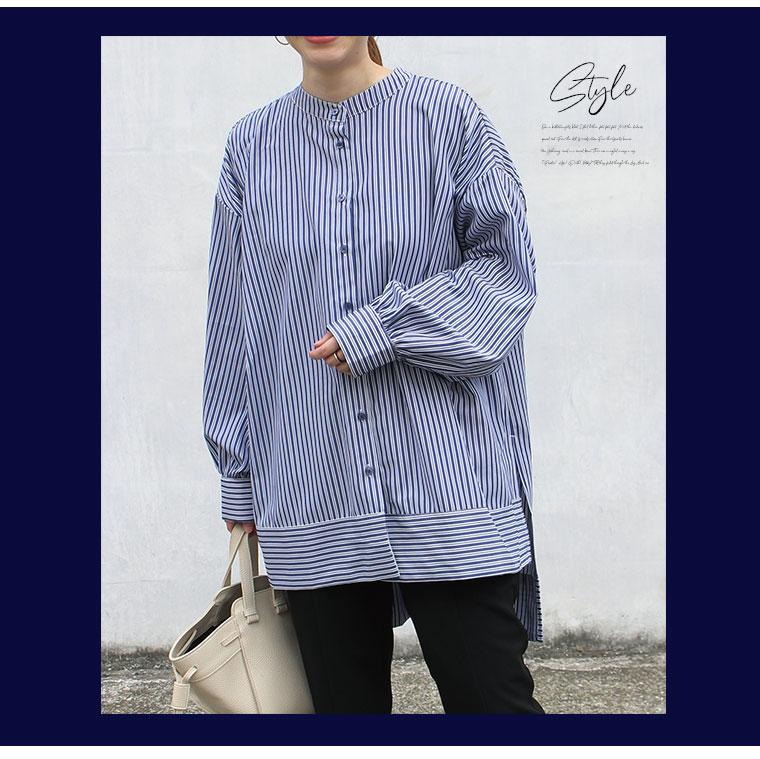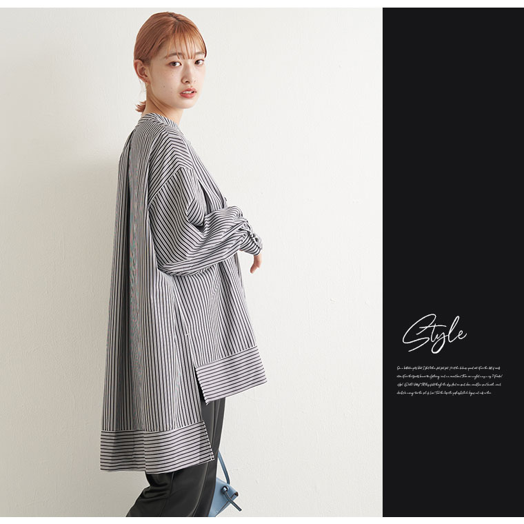 少し厚手のワイシャツのような生地でキレイめ、高見えします。 洗濯すると硬くて強めのシワが出来るのでアイロンがけは必須です。 丈が広がっているので、胸周りにボリュームがあるとそのまま広がるシルエットです。