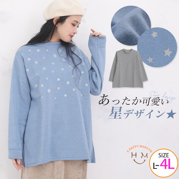プルオーバー LL 3L 4L 冬 冬物 冬服 ぽっちゃり ゆったり かわいい おしゃれ カジュアル プラスサイズ 胸周り 二の腕カバー 長袖 ナチュラル きれいめ 上品 ガーリー 裏起毛 ラメ 星 プチハイ チュニック