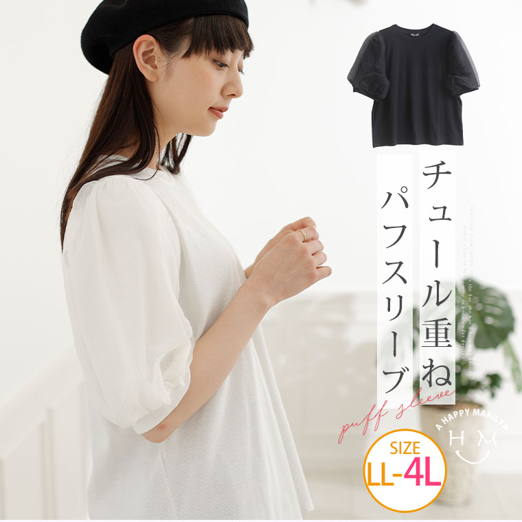 3. 大きいサイズ チュール重ね スリーブ カットソー