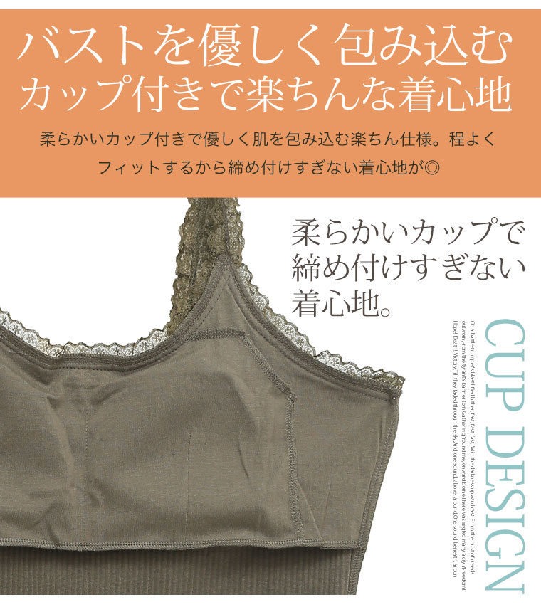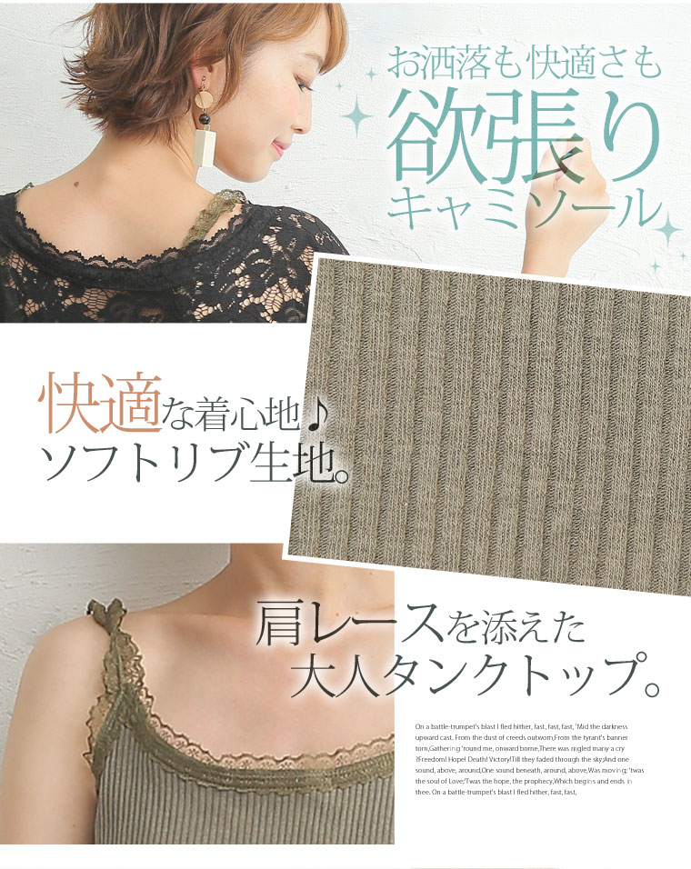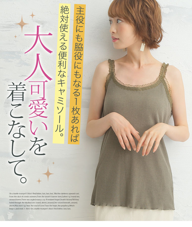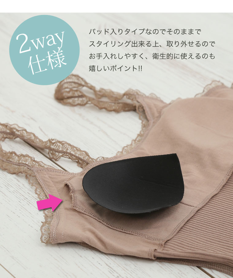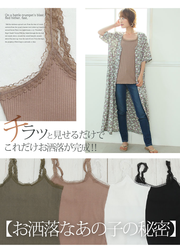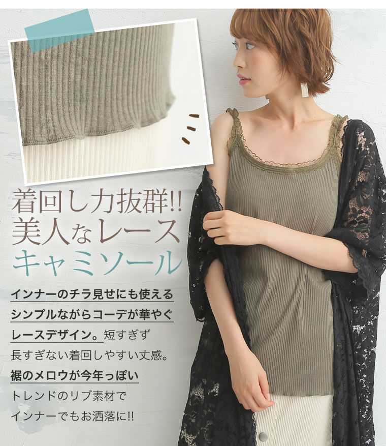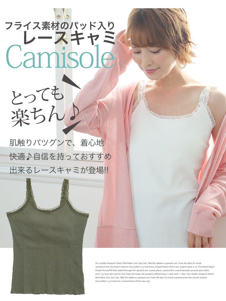 華やかレースが女性らしアクセント。パッド入りフライスキャミソール