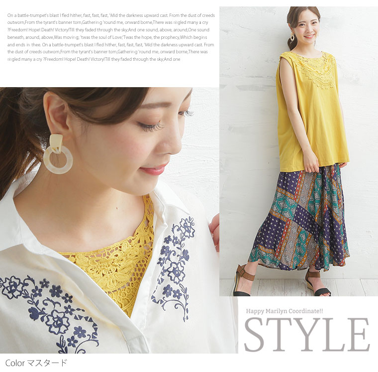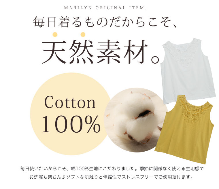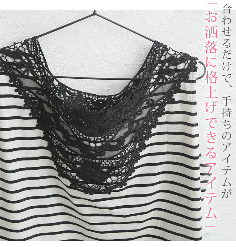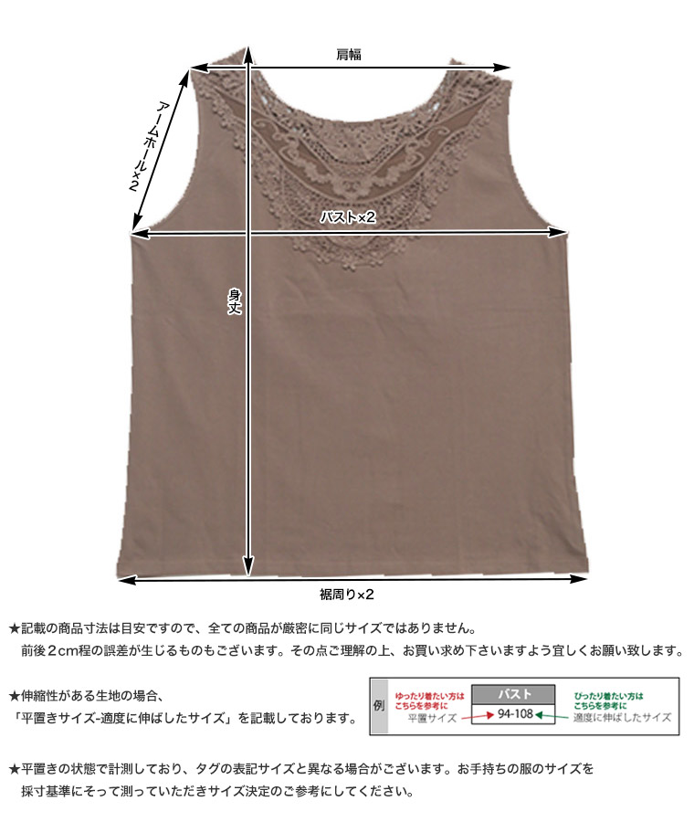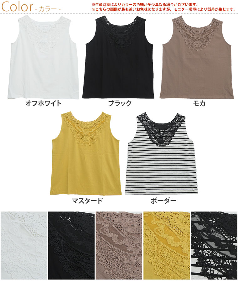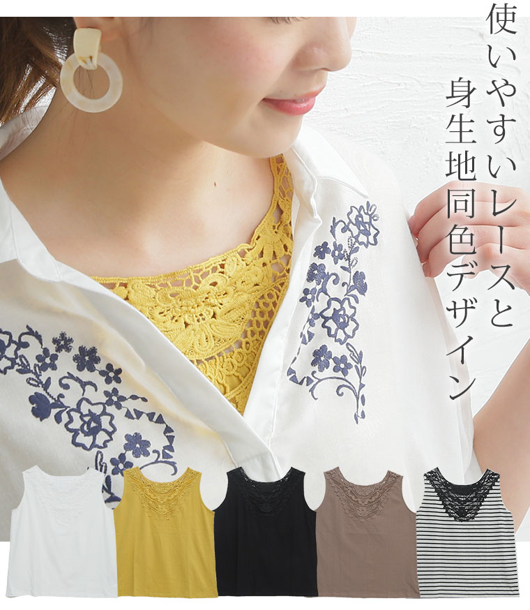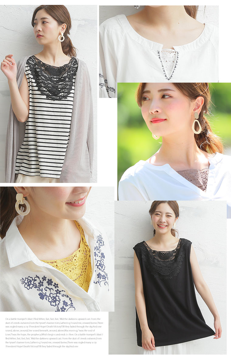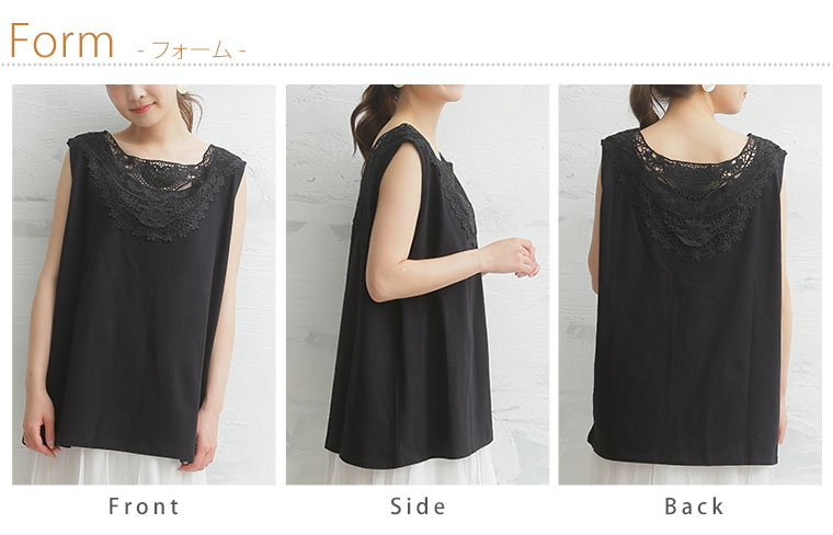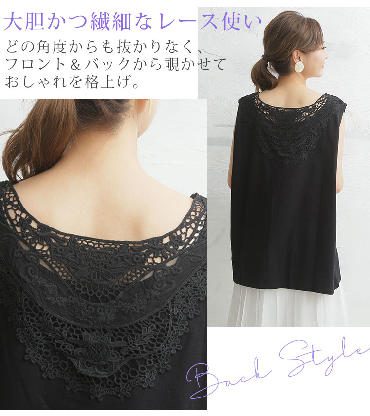どんなスタイルにも使いやすい、前後モチーフレース付タンクトップ