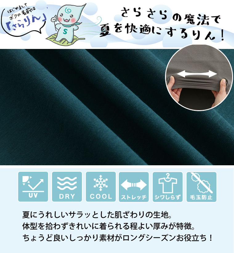 のびる生地で触るとサラッとしています。大きめを選んだのでレイヤーとして季節関係なく使えそうです。
