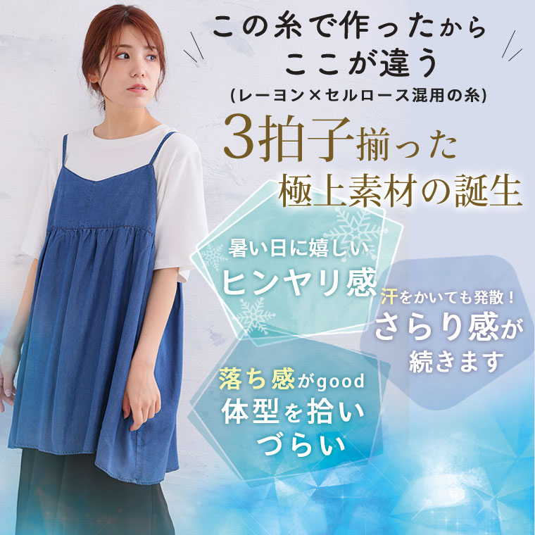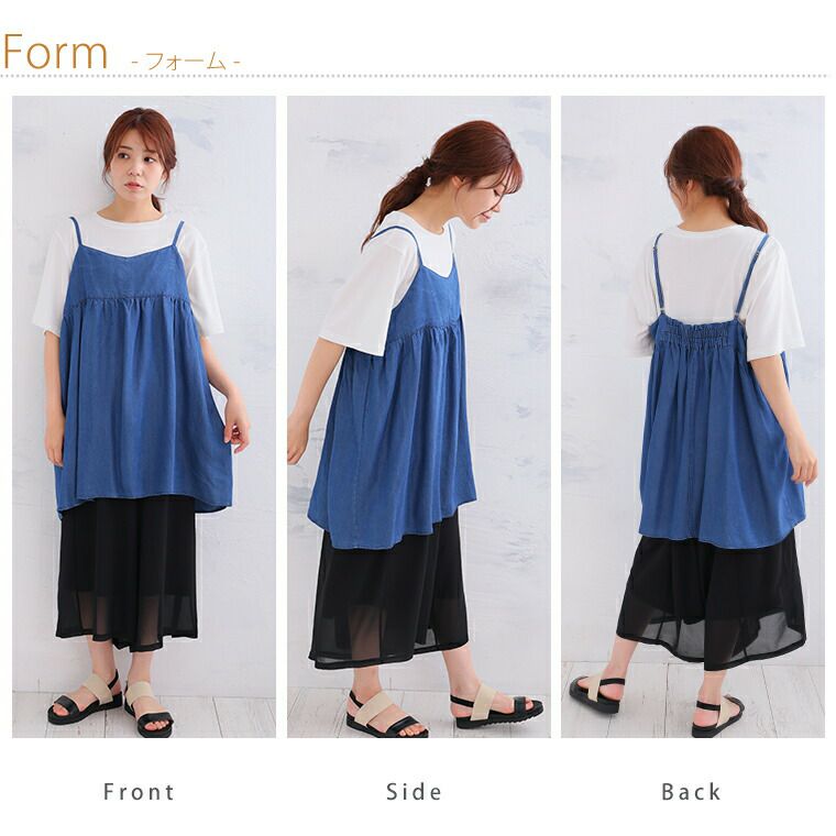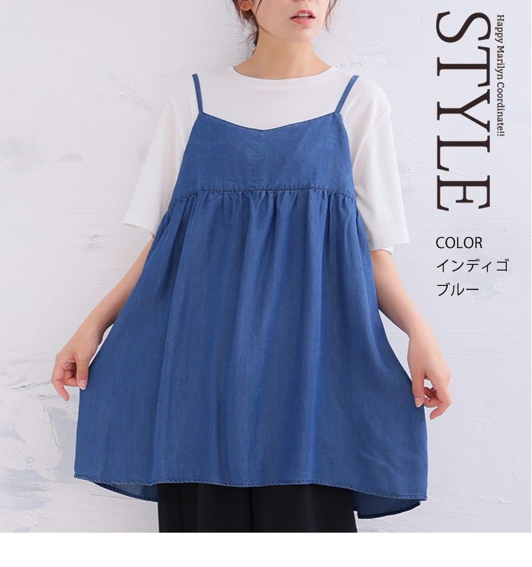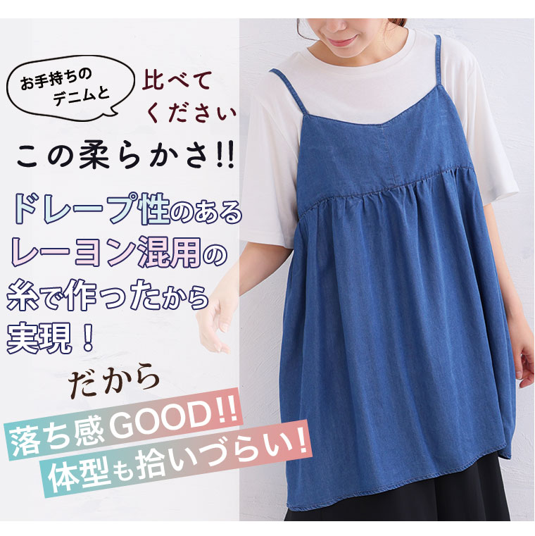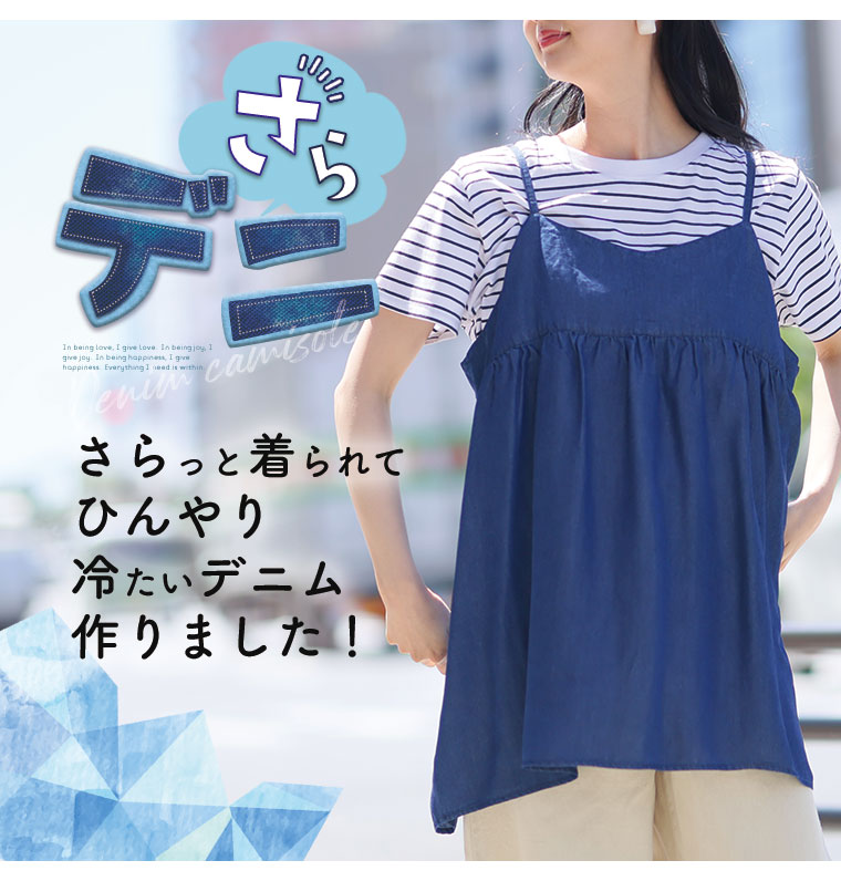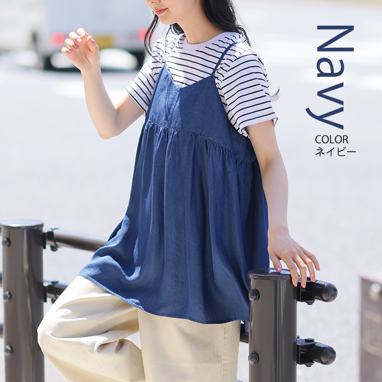 ギャザーの切り替え位置が高く、スタイルアップが叶うデニムキャミソール。