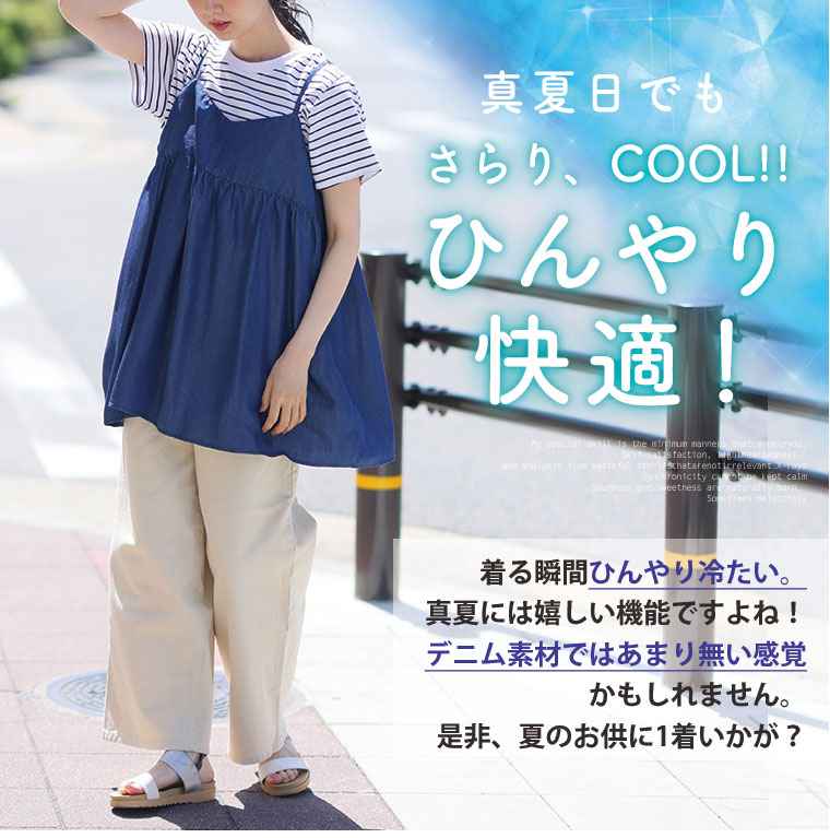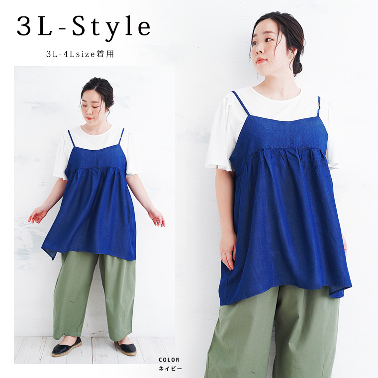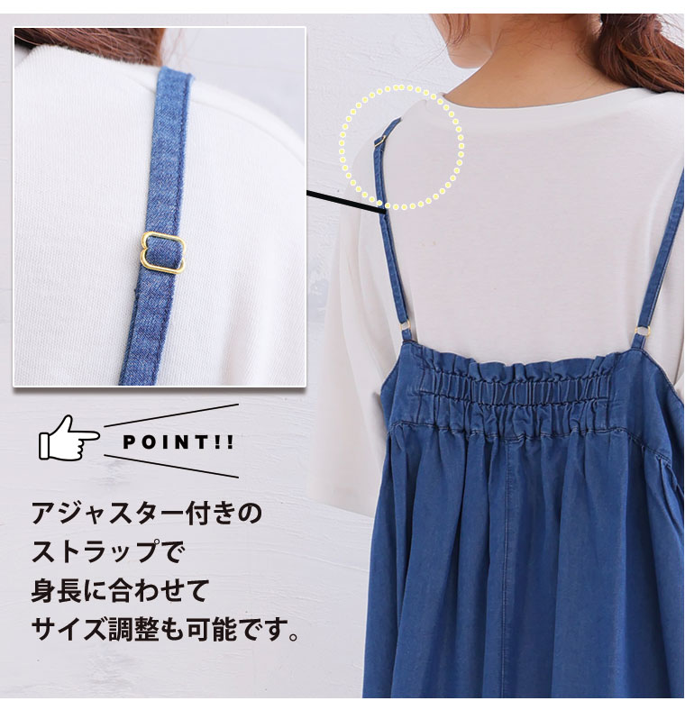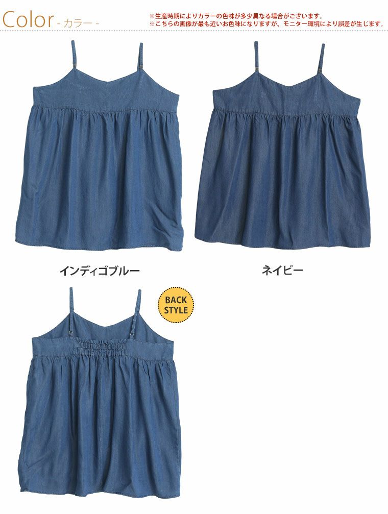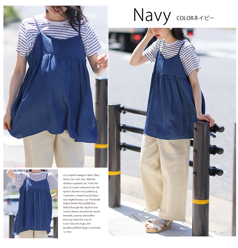 ギャザーの切り替え位置が高く、スタイルアップが叶うデニムキャミソール。