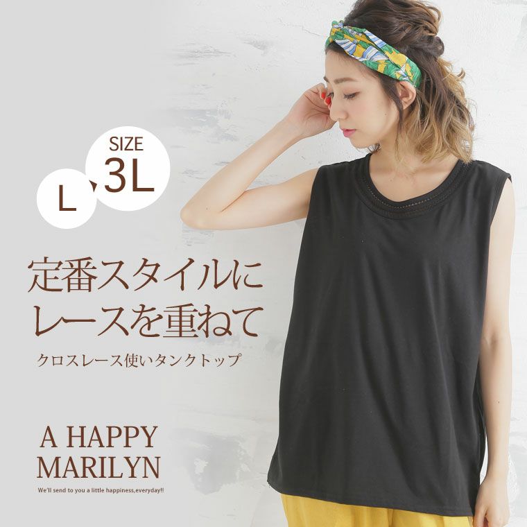 ネックラインを飾るクロスレースがアクセント。シンプルデザインタンクトップ