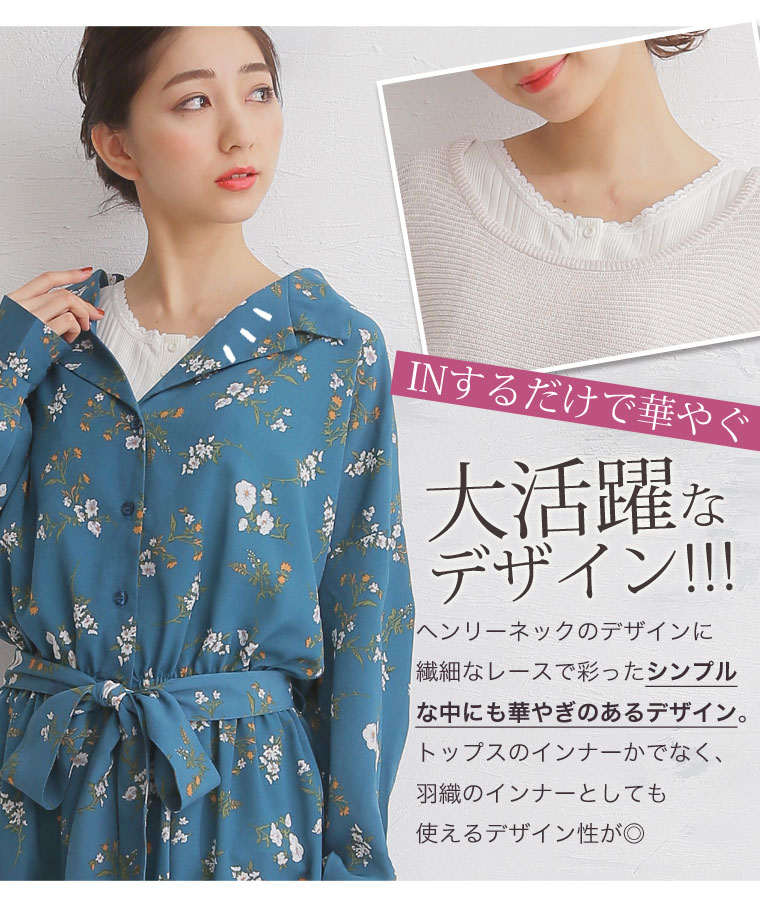 襟ぐりと袖部分のレースがフェミニンさをプラス。レイヤードにもおすすめの1枚。