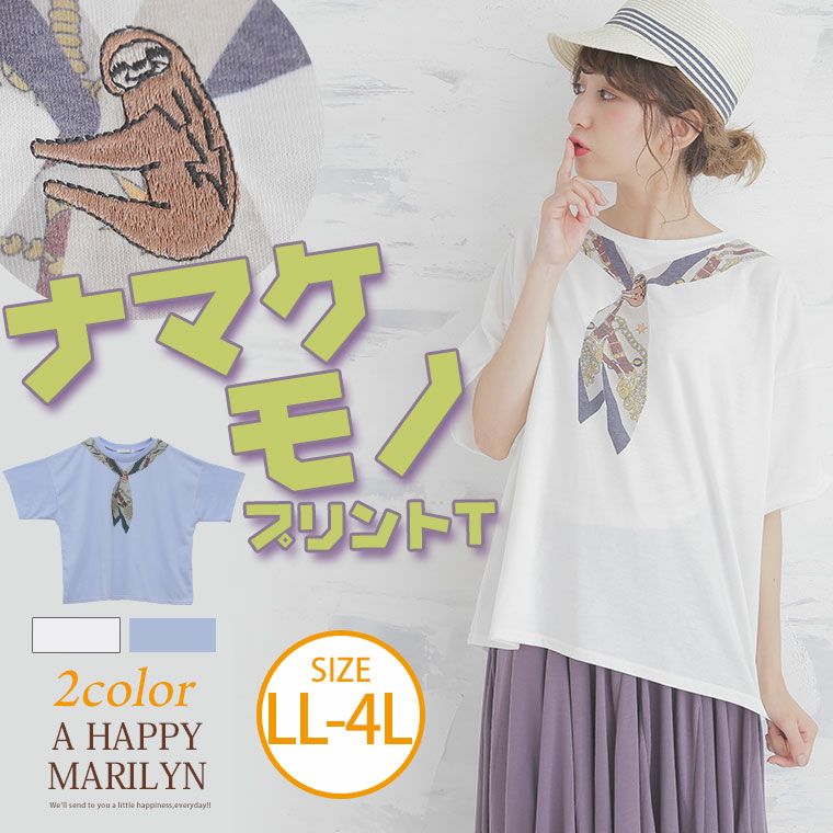 襟元のナマケモノの刺繍がゆる可愛いポイント☆スカーフプリント半袖カットソー
