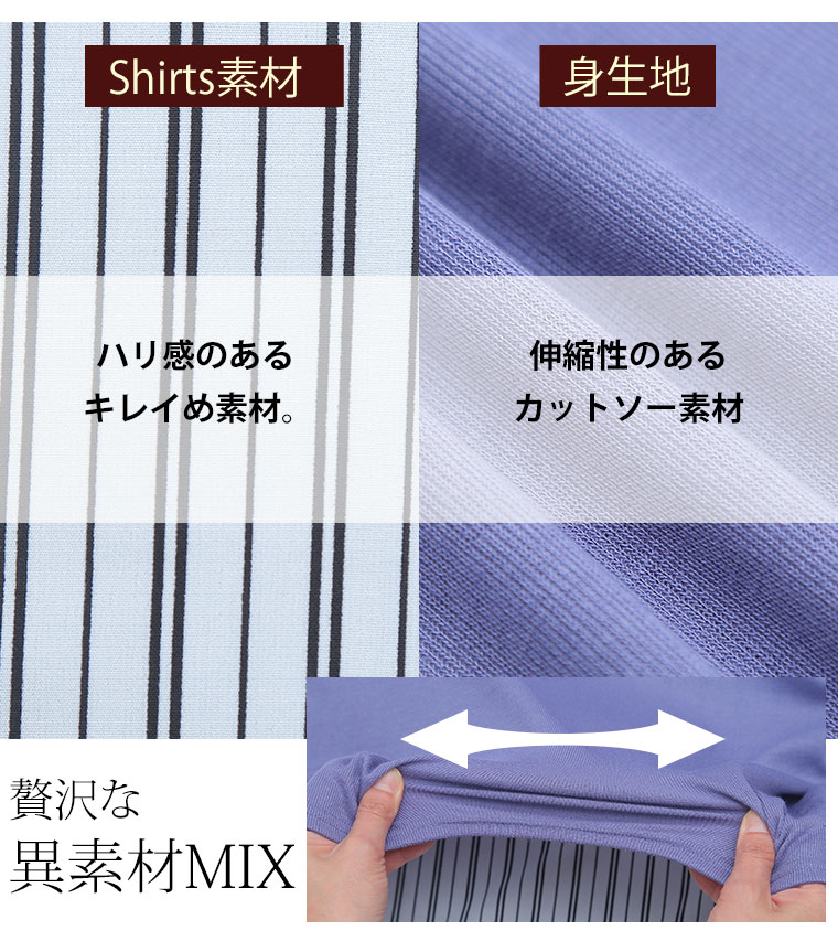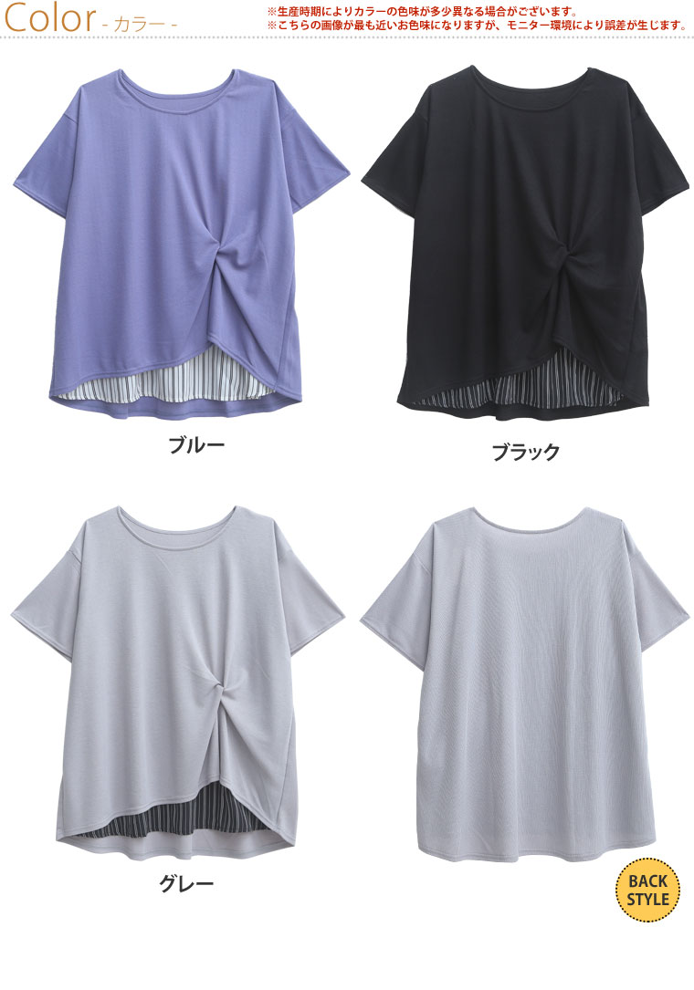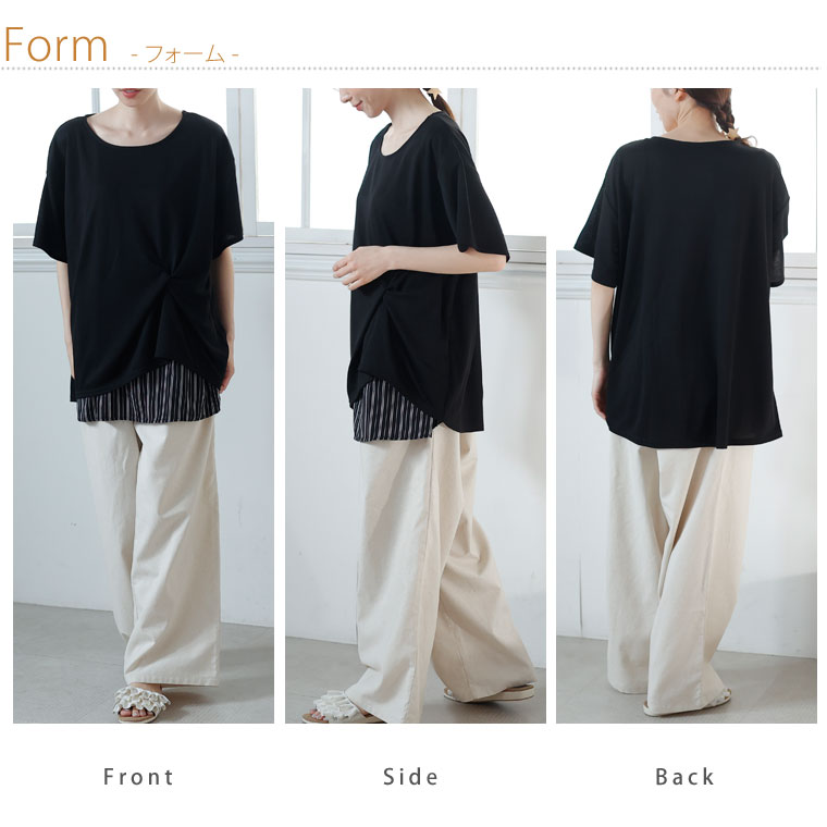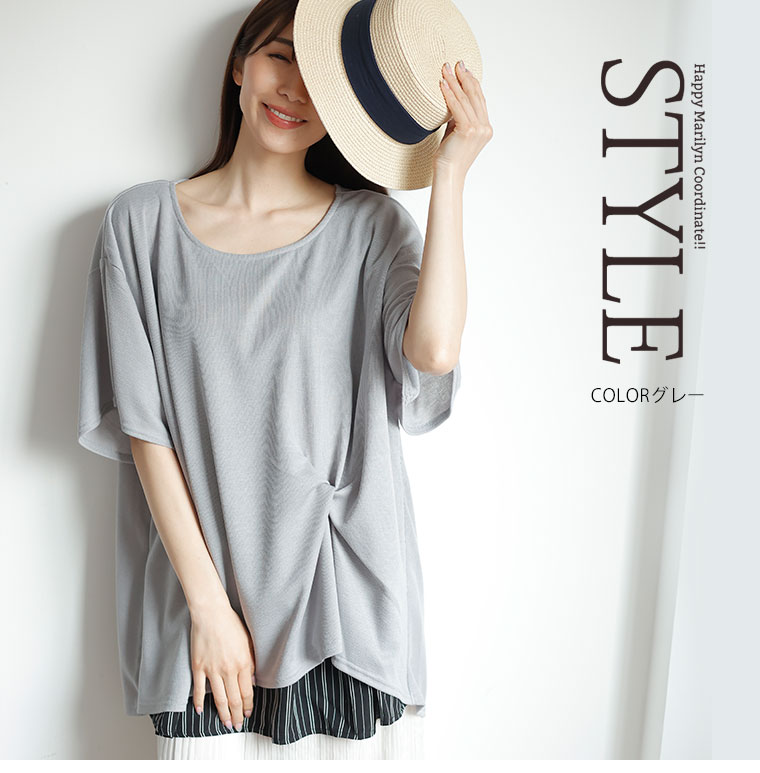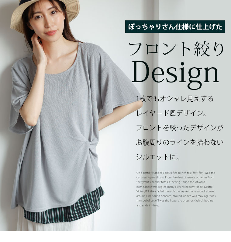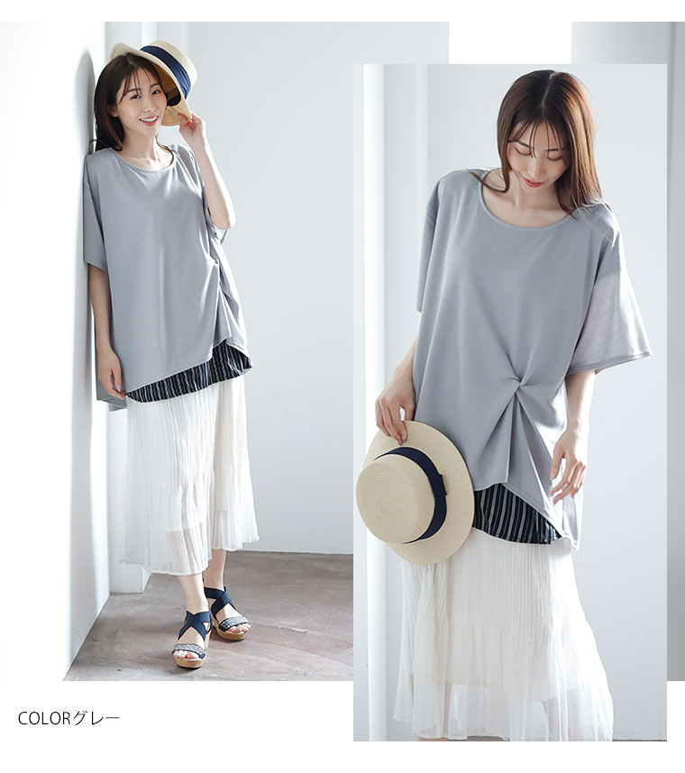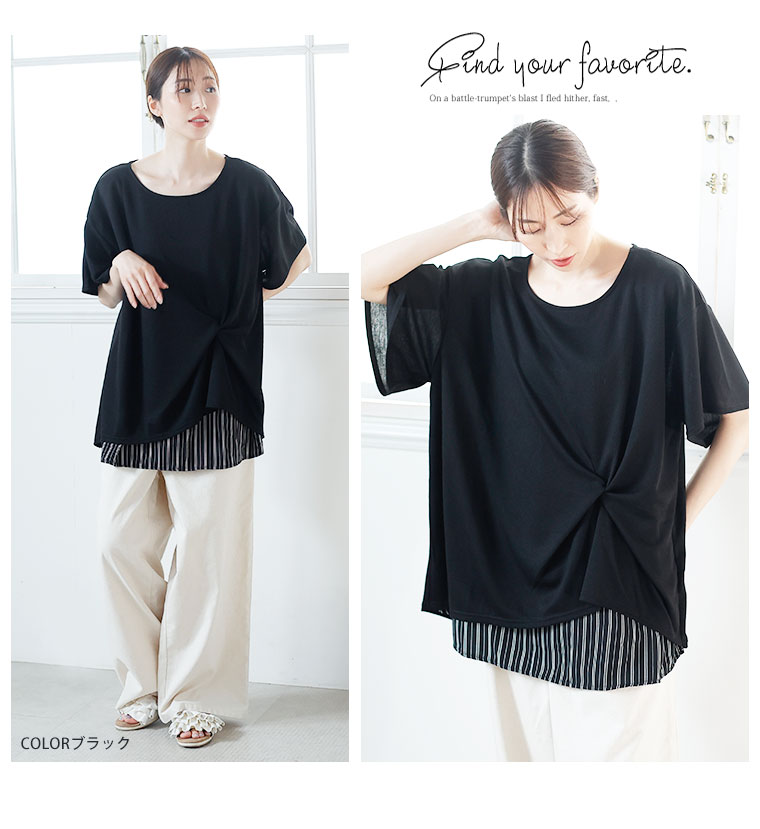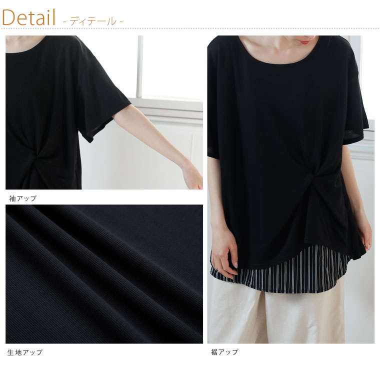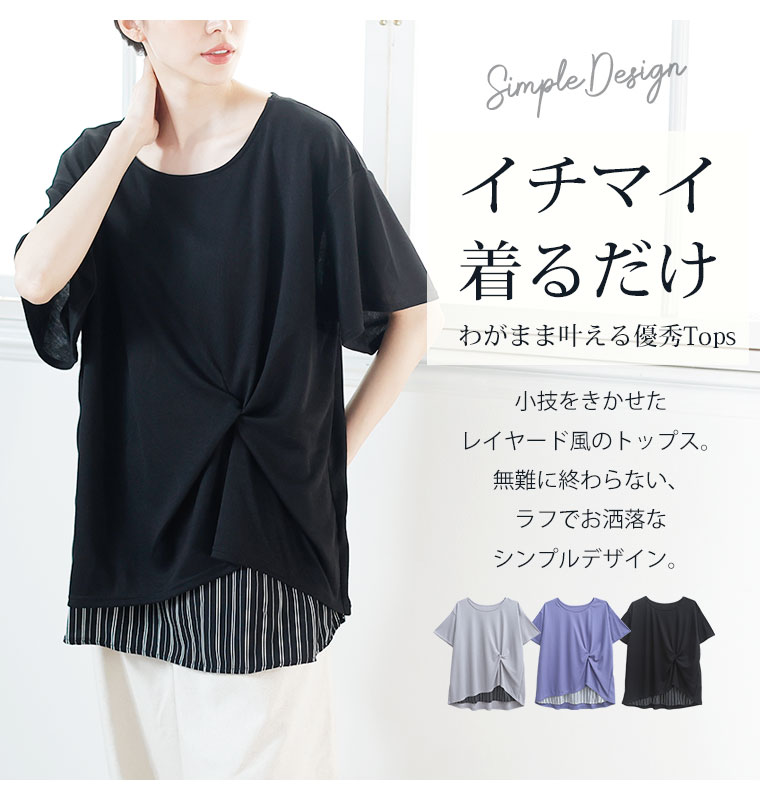 小技をきかせたレイヤード風のトップス。ラフでお洒落なシンプルデザイン。