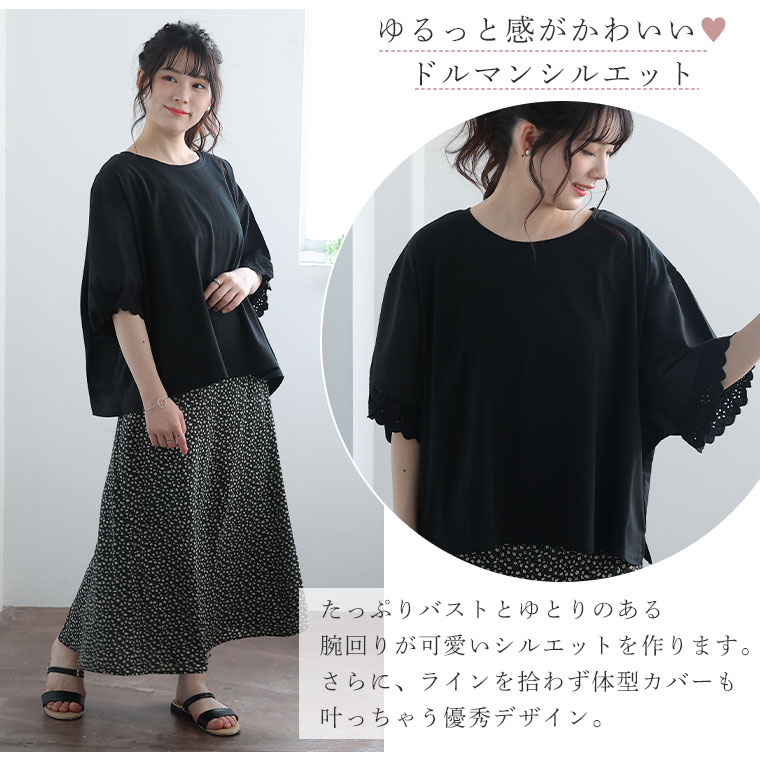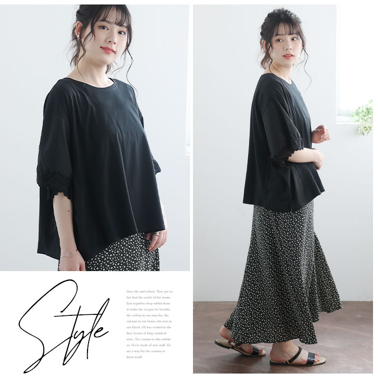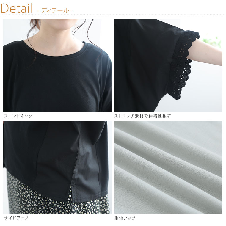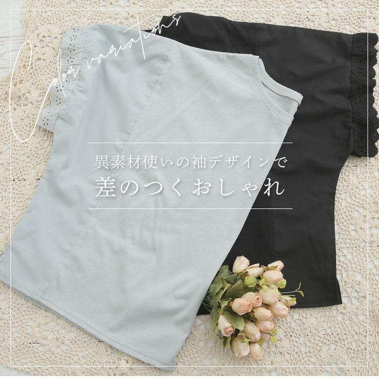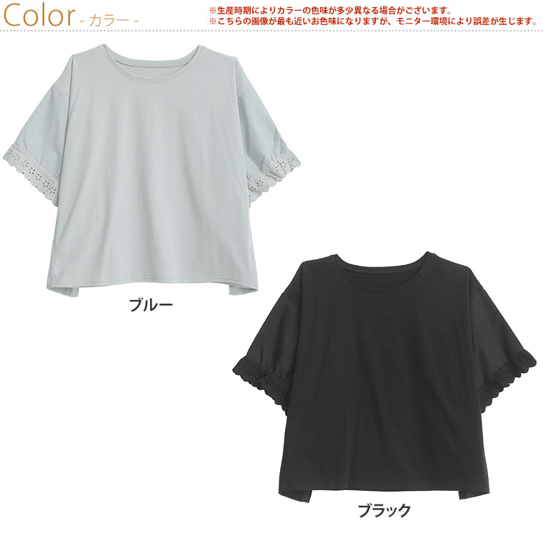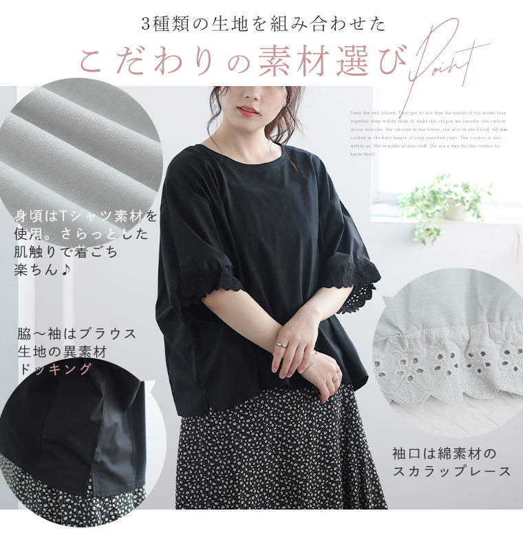 袖口レースが可愛い 異素材MIXゆったりTOPS