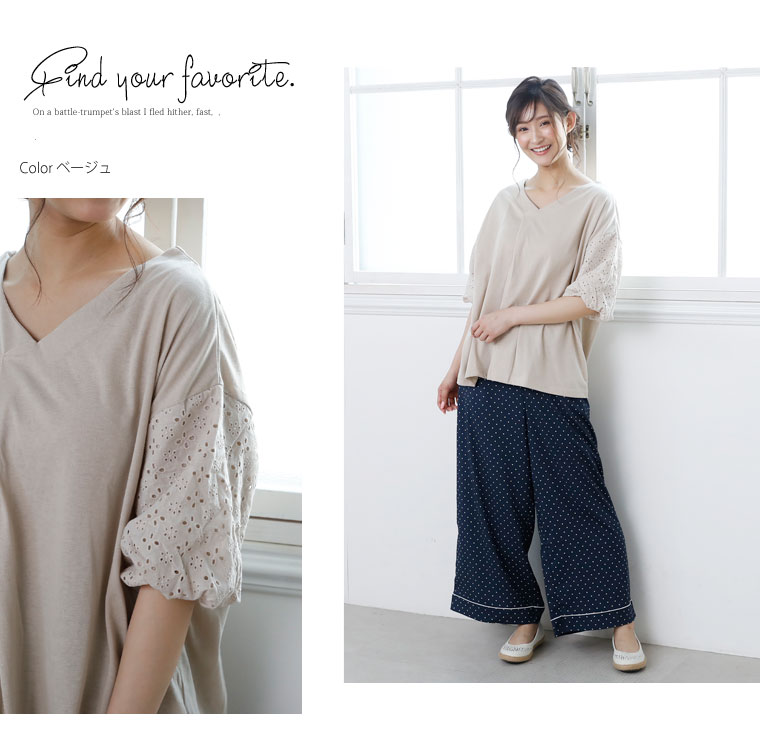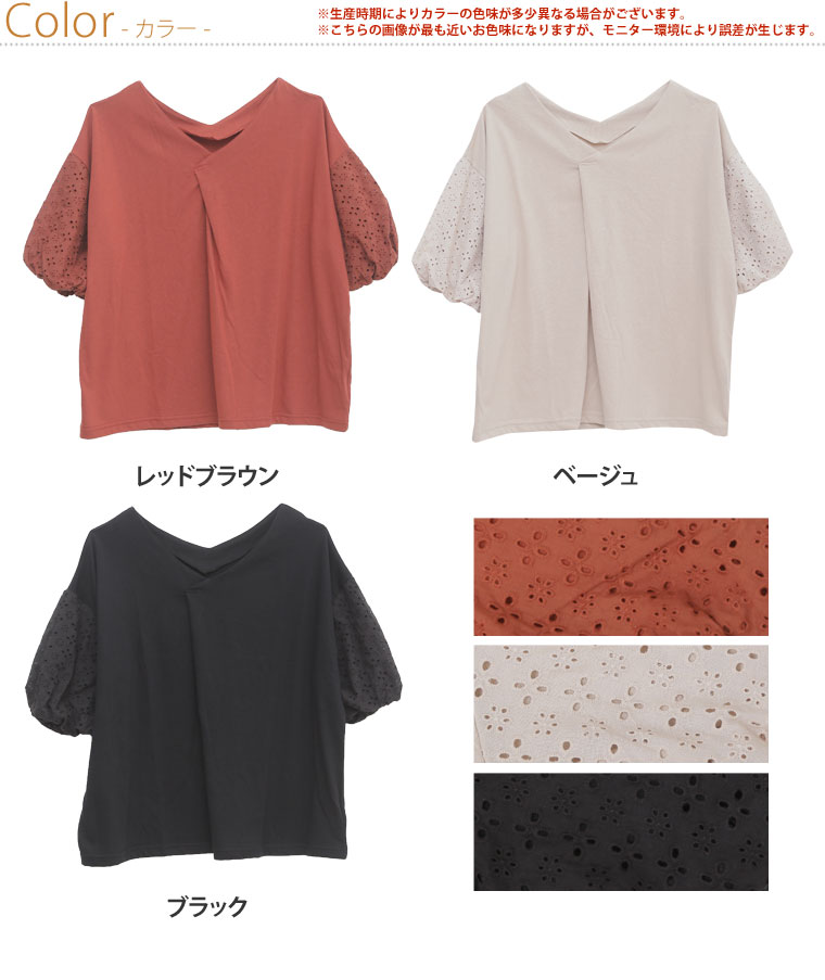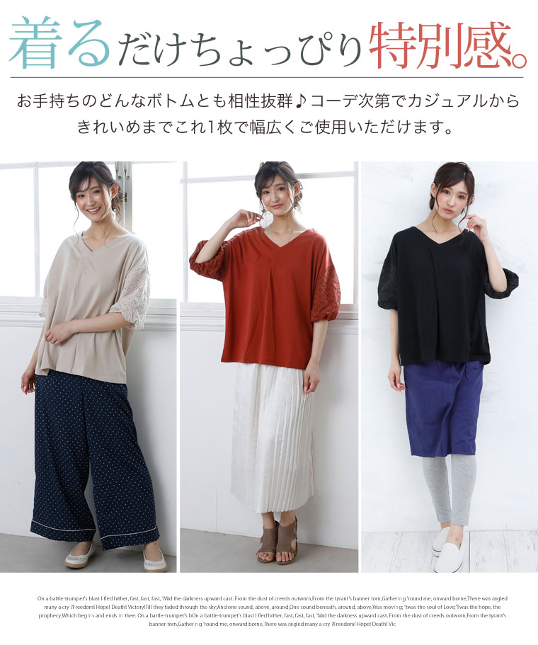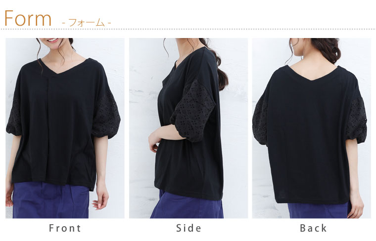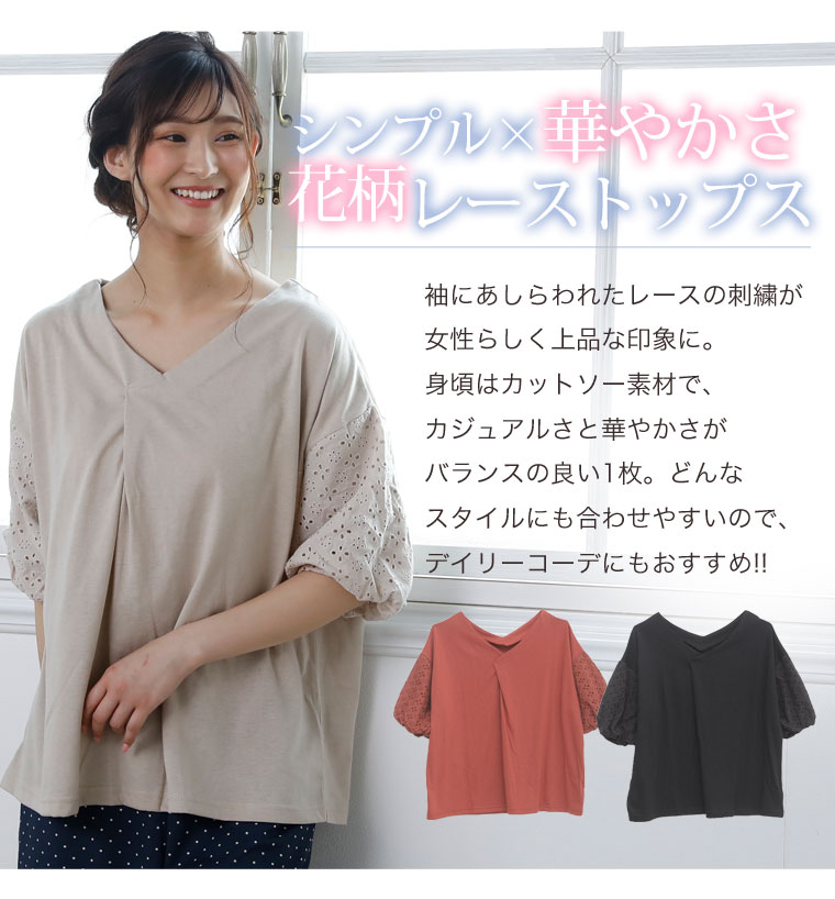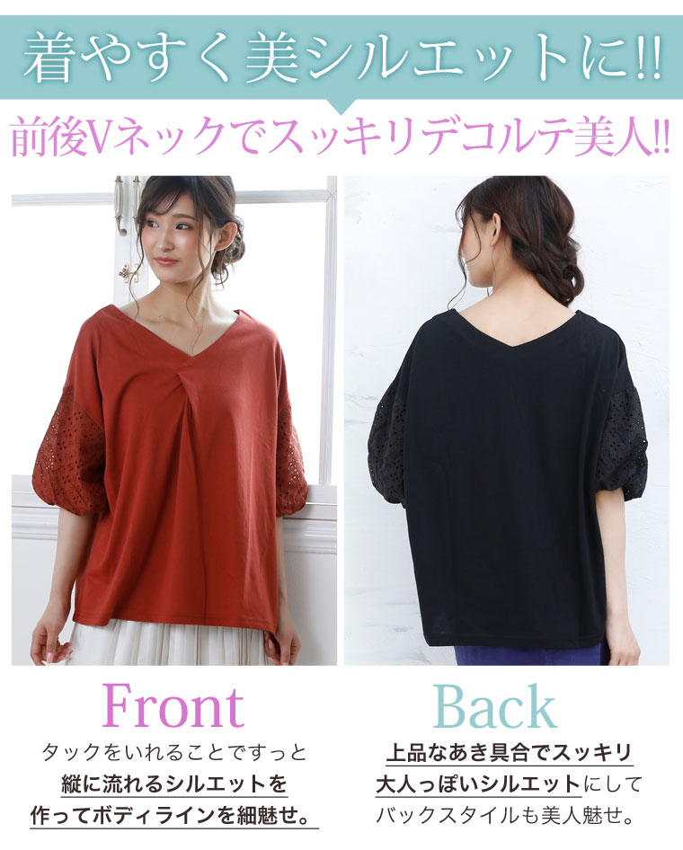 袖レース刺繍でふんわり二の腕カバーが出来るVネックカットソー
