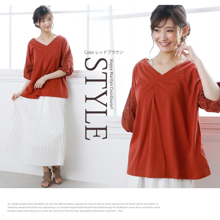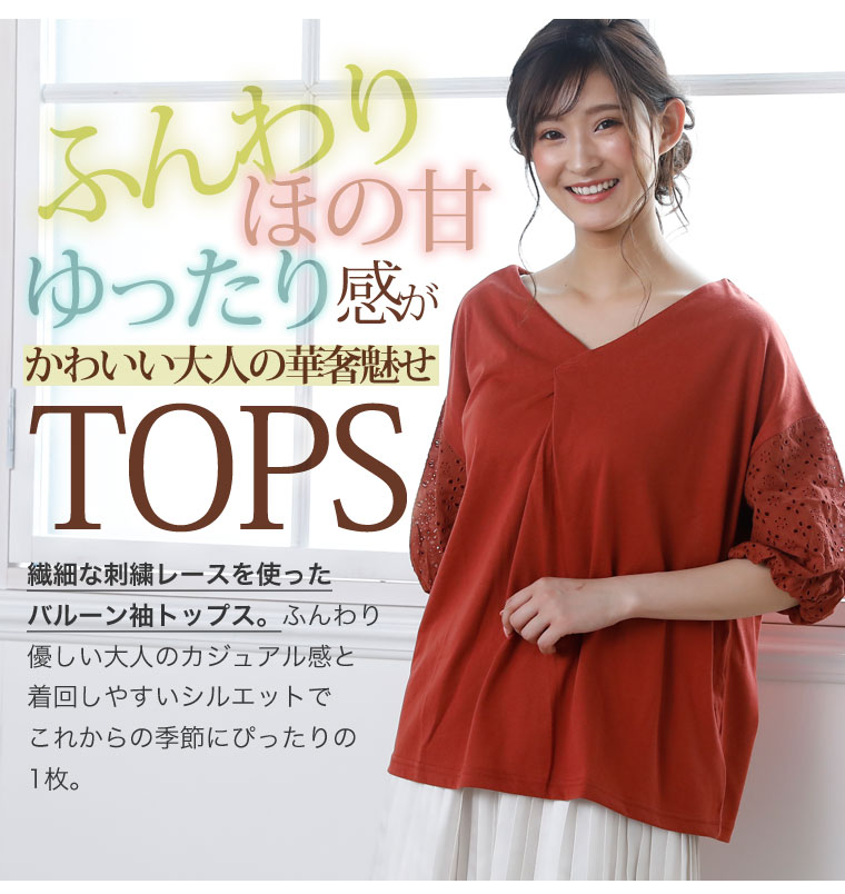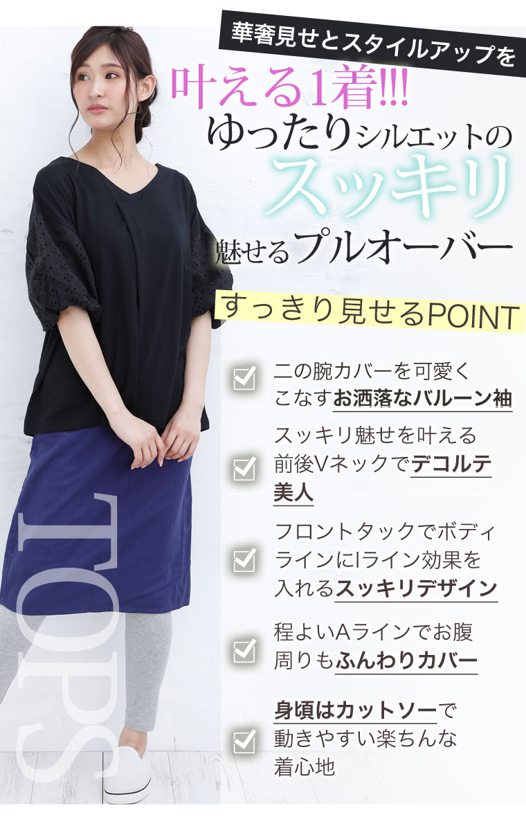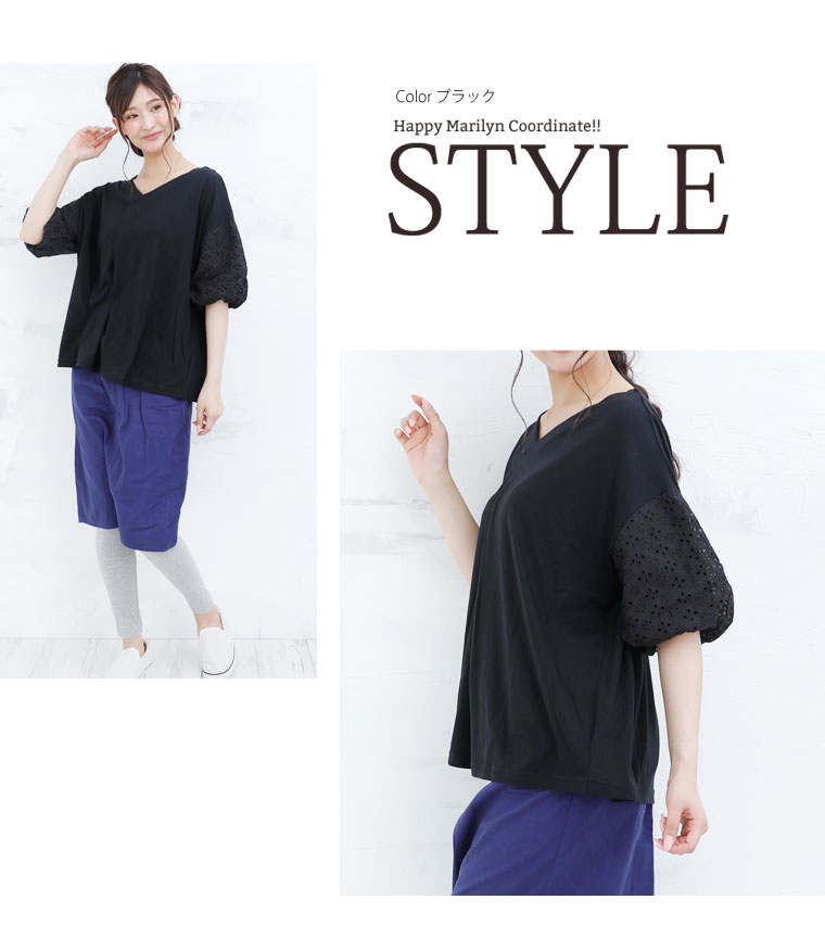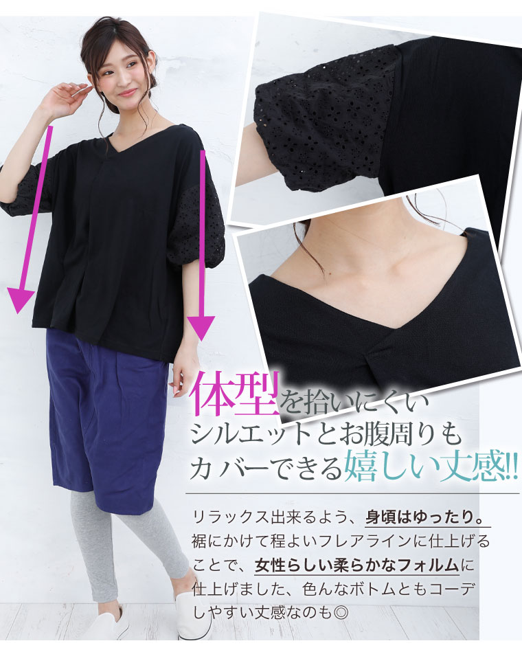 袖レース刺繍でふんわり二の腕カバーが出来るVネックカットソー