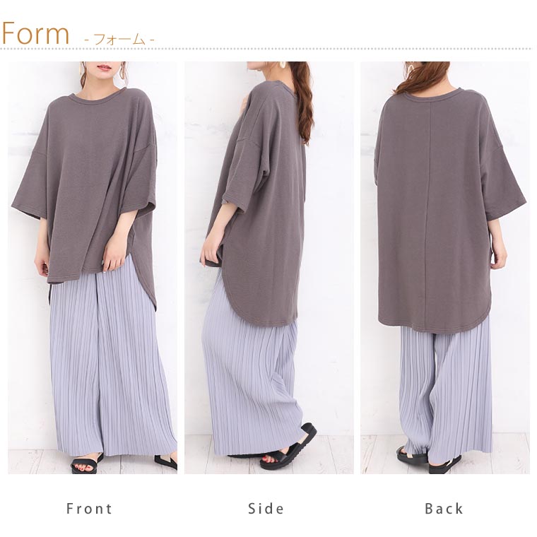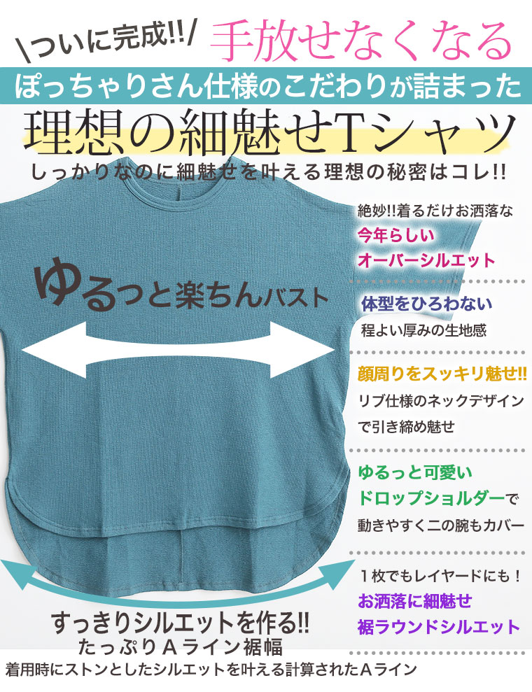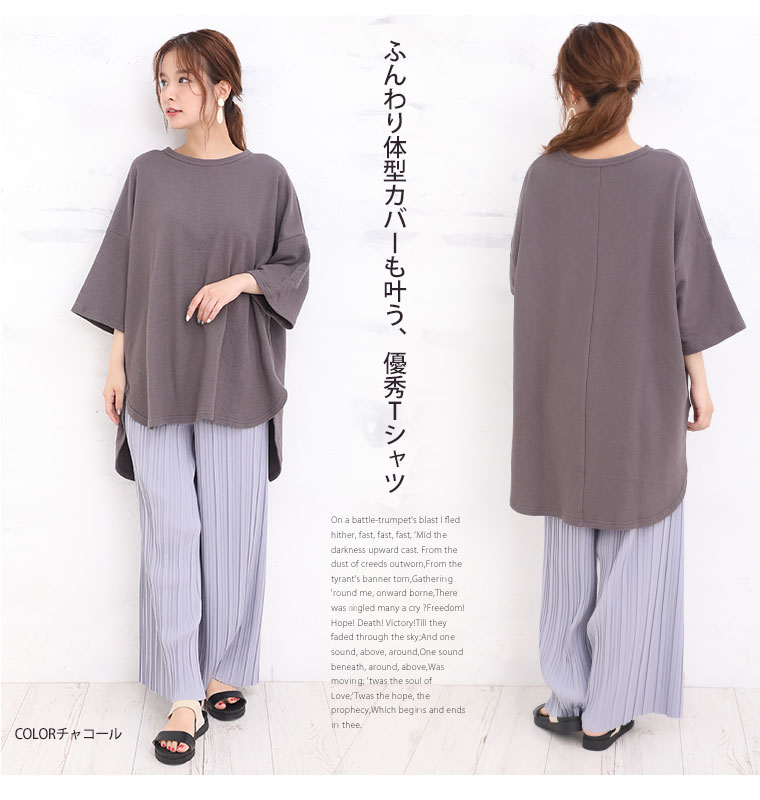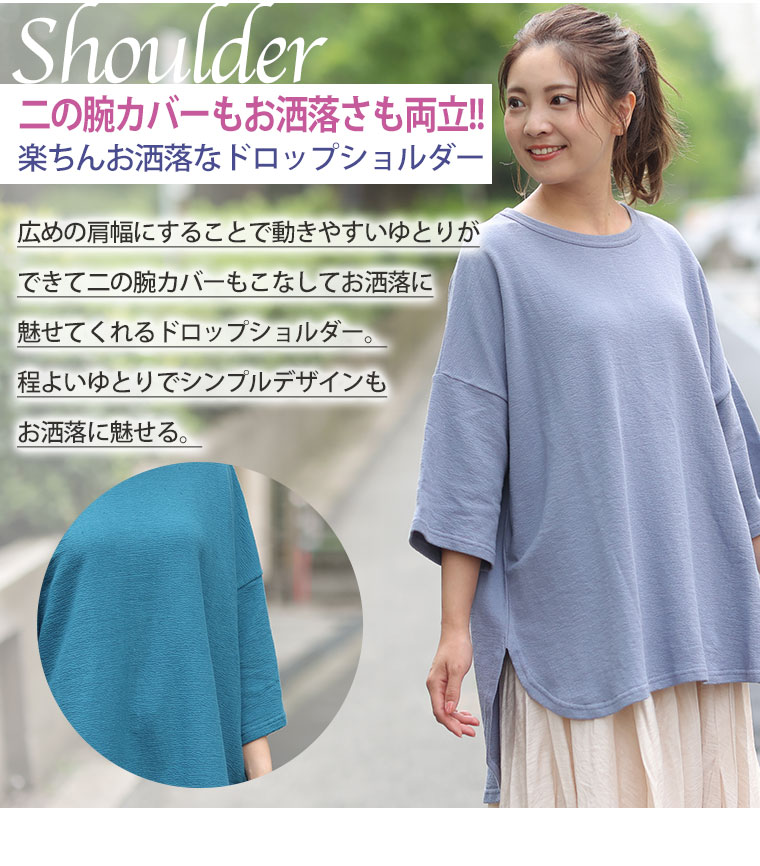 ゆとりありで着用できました。ドロップショルダーでしっかり二の腕をカバーしてくれるのも嬉しい。着丈はお尻がしっかりかくれます。