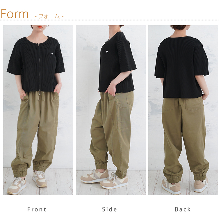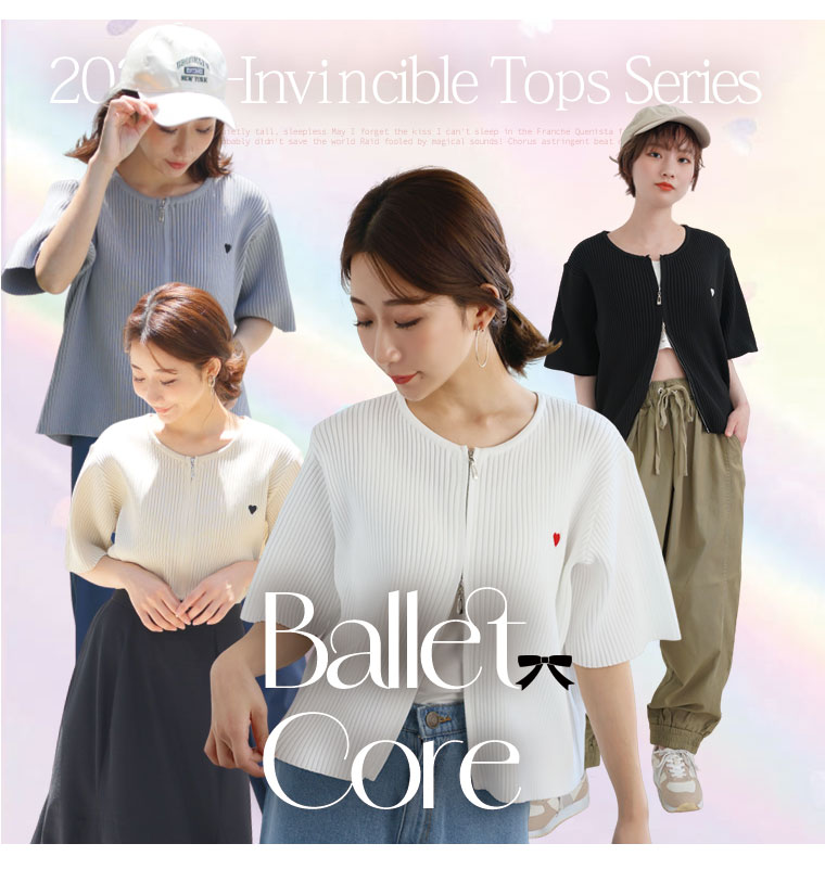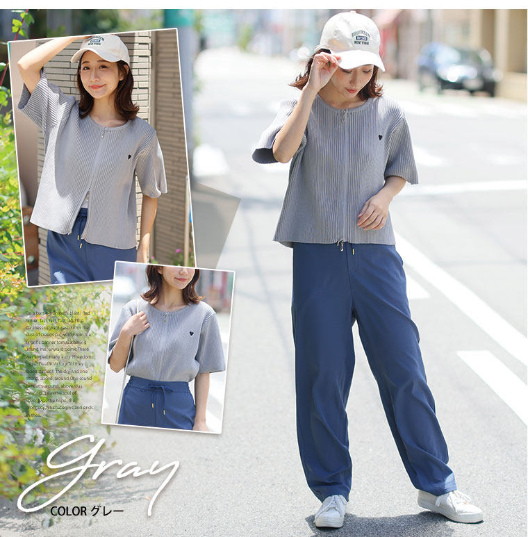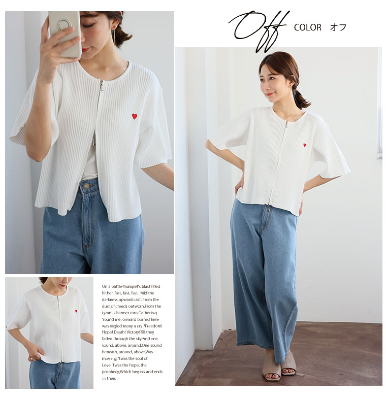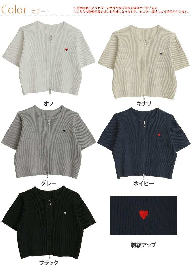 細かいリブ素材と体に張り付きすぎないサイズ感にWジップとワンポイントのハートが目を惹く