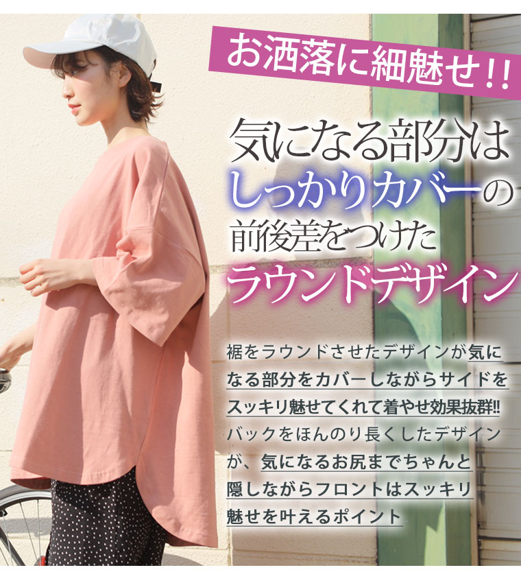 大きいサイズ ぽっちゃりさんに嬉しい! 綿100% ゆったり裾ラウンド 細魅せ 五分袖 Tシャツ