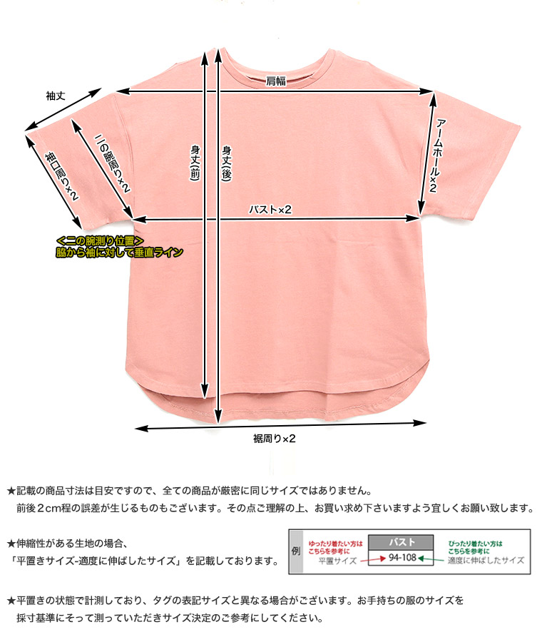 サイズ単位:cm 身丈(前/後) バスト 肩幅 アームホール 二の腕周り 袖丈 袖口周り 裾周り(直線) 素材/透け感