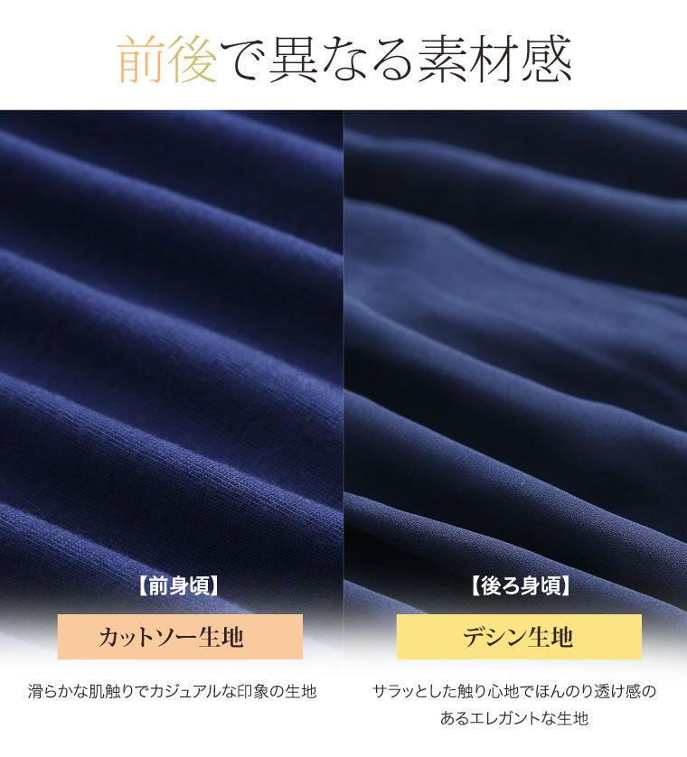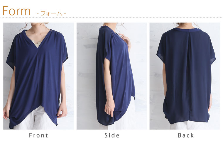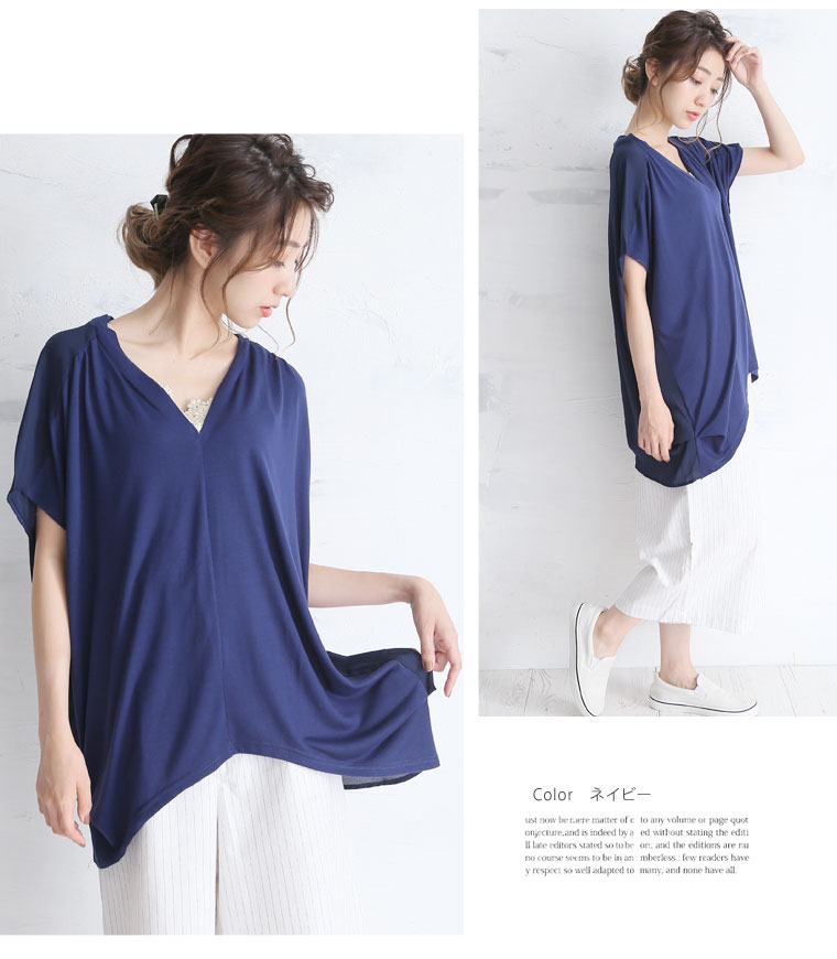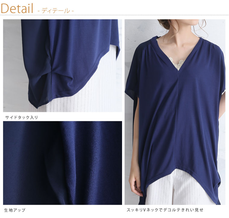 お尻が隠れる長め丈で安心の着心地に。深めVネックでデコルテスッキリ魅せ