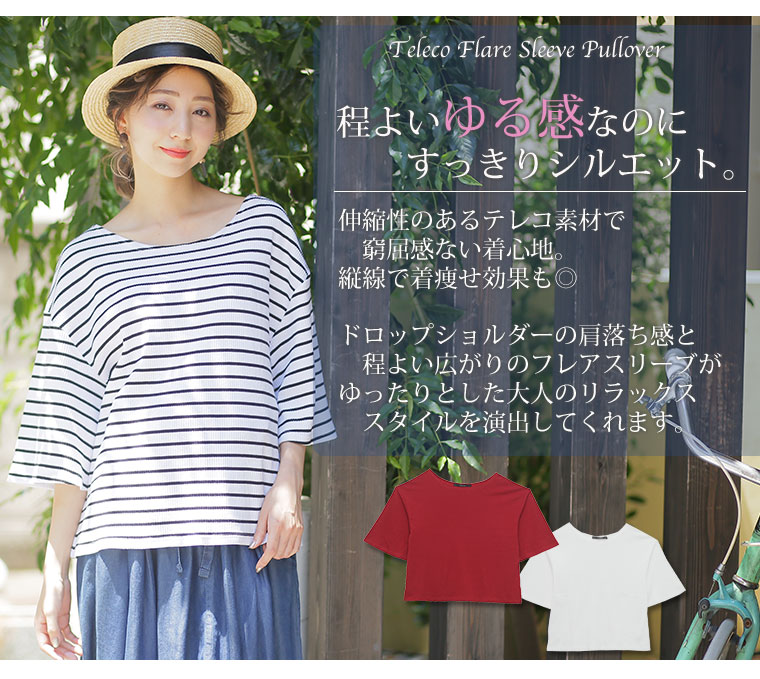 無地とボーダーから選べる!テレコストレッチ素材フレアスリーブ半袖プルオーバー