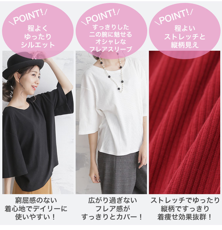 テレコ素材の縦線で着痩せ効果◎ドロップショルダーでゆったりとした着心地