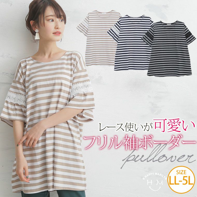 ゆったり楽ちん!フリル袖レース使いボーダープルオーバー