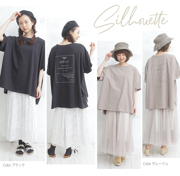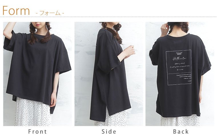 前はシンプル、後ろは大胆に上品なフォントで大人っぽく着こなせるルーズなバックロゴ