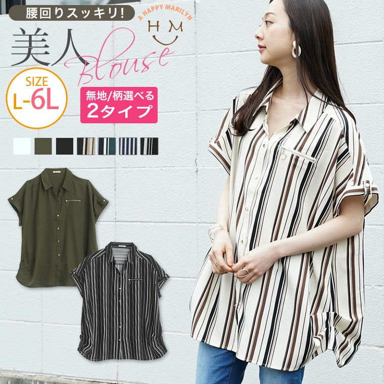 無地とストライプで選べる ジップ付き脇タックスキッパーシャツブラウス