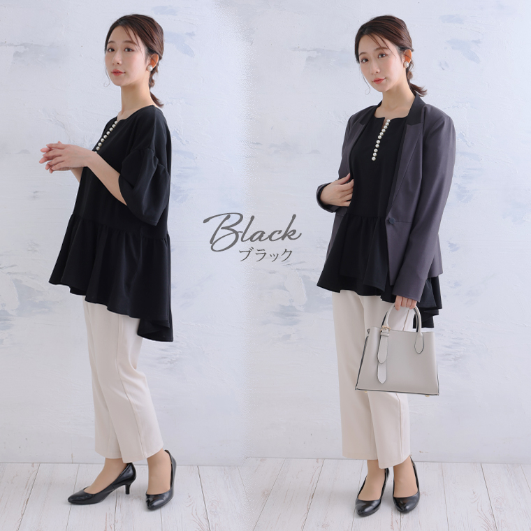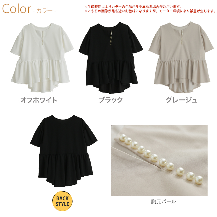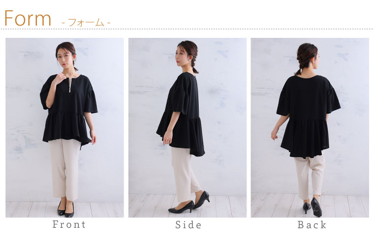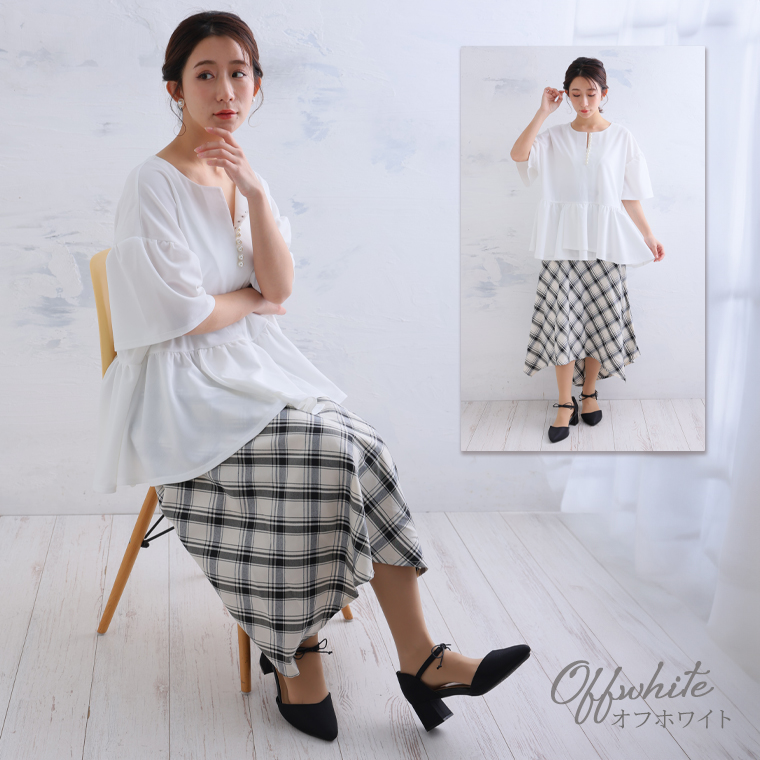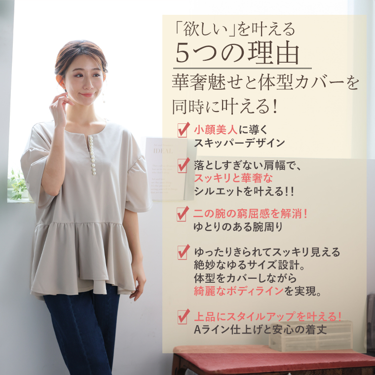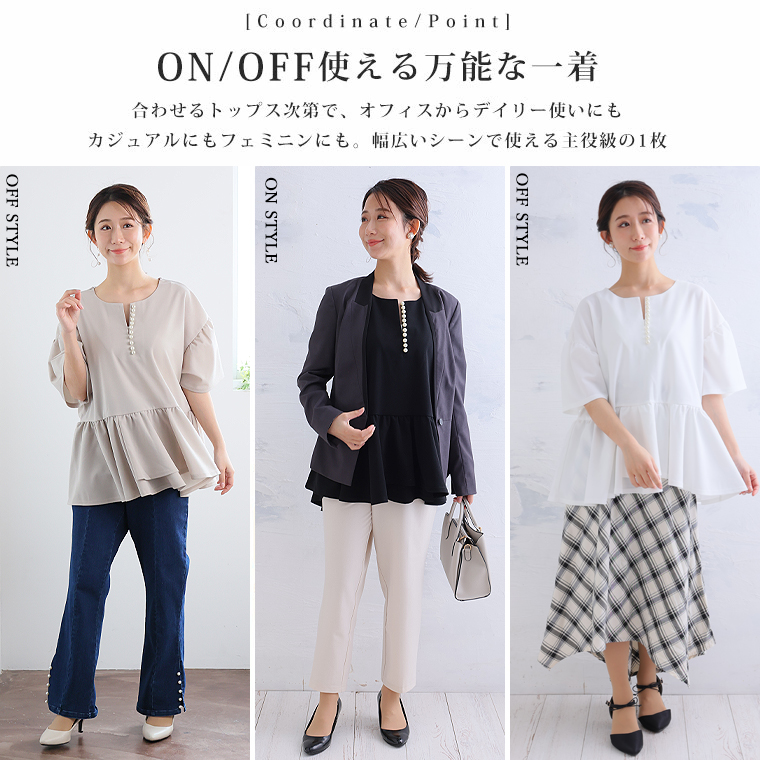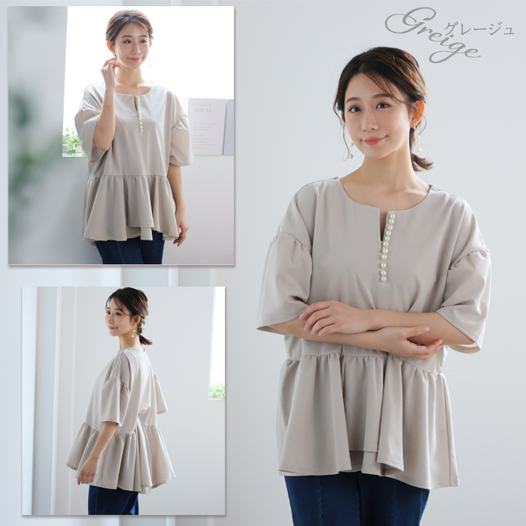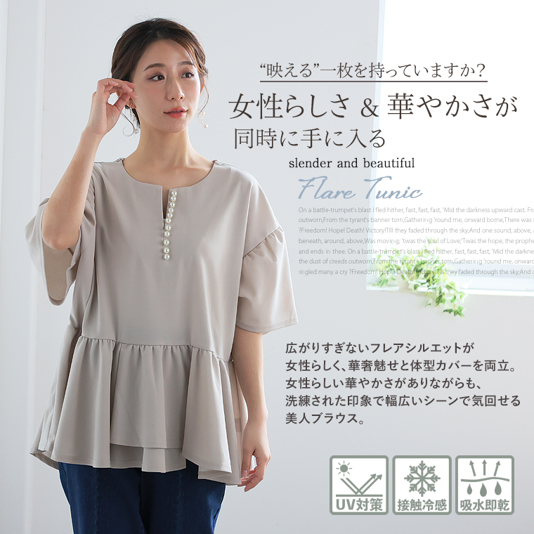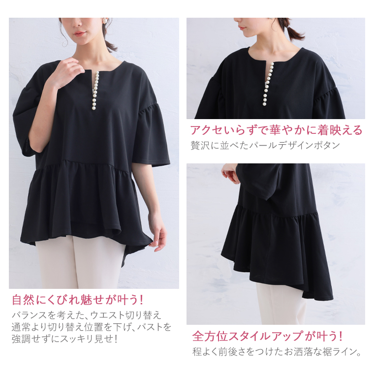 イージーケアで快適に華やぐ!上品パールボタンフレアブラウス