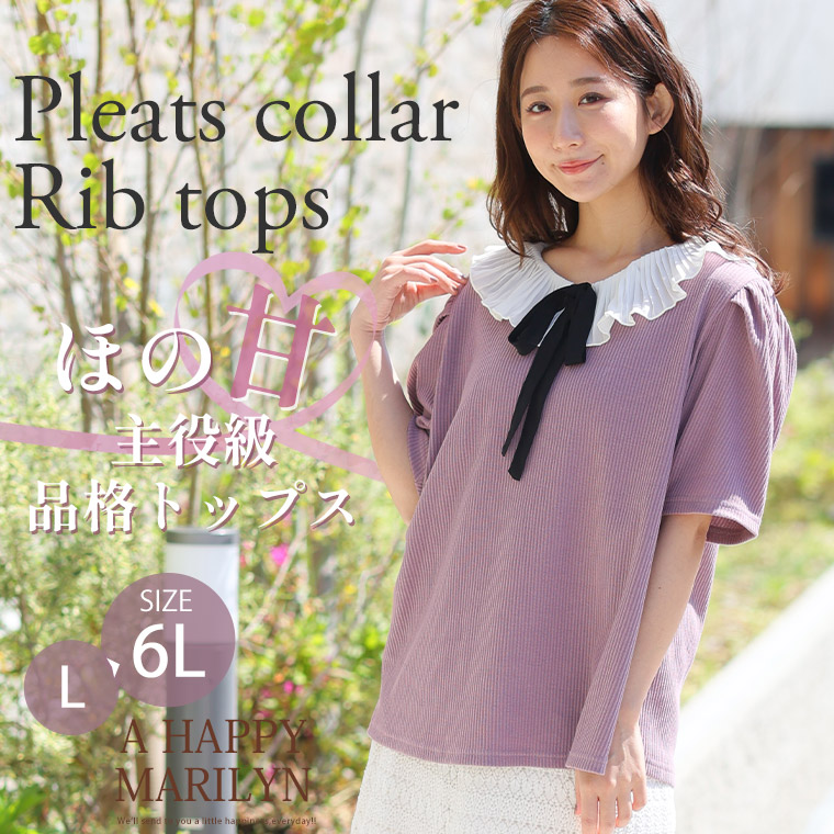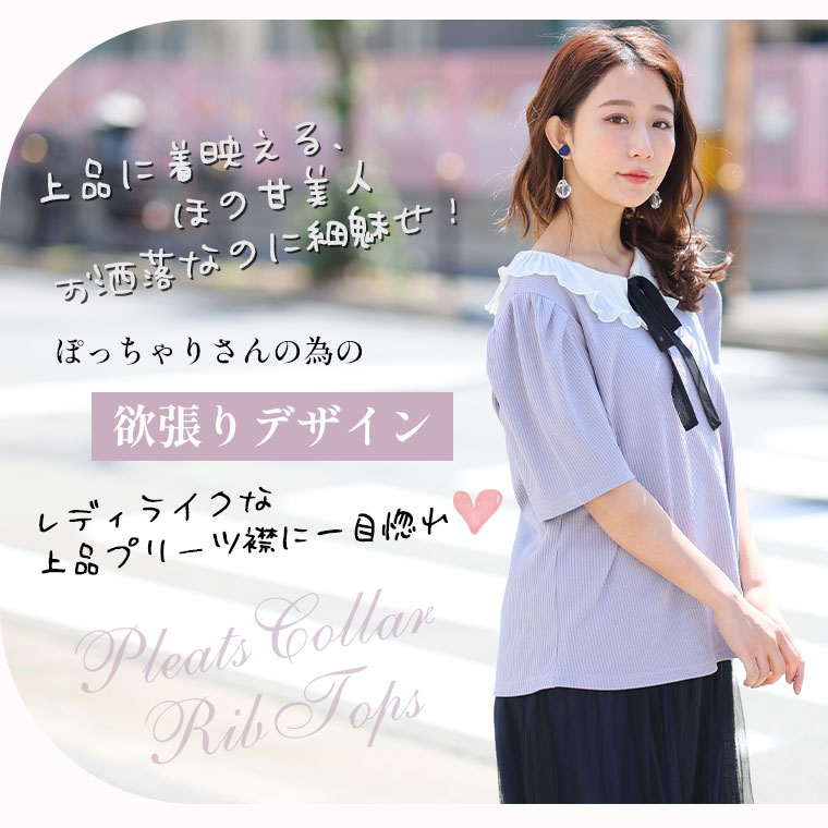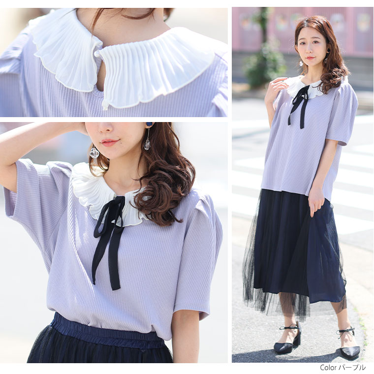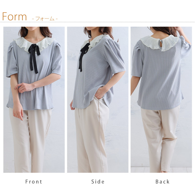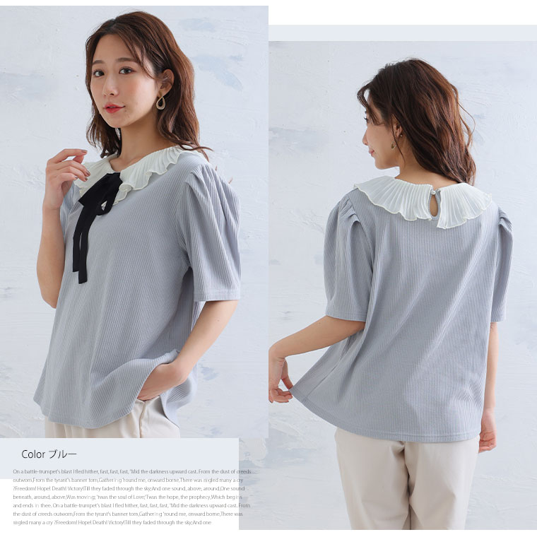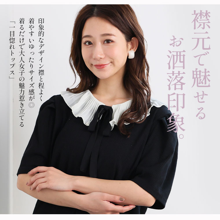 着心地リラックス快適リブ素材 フェミニンフリル襟トップス