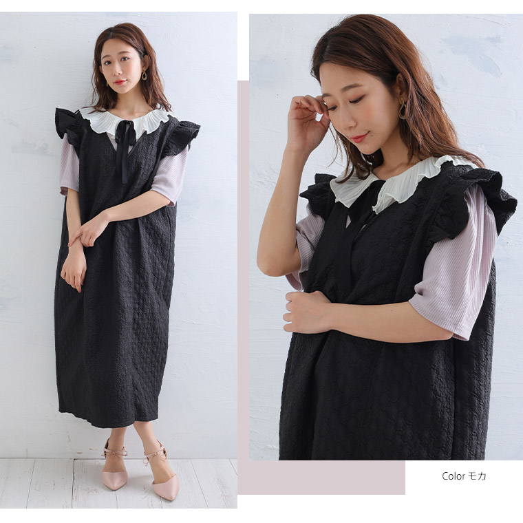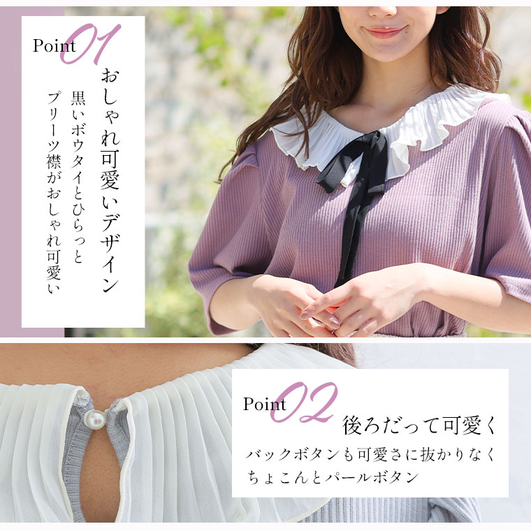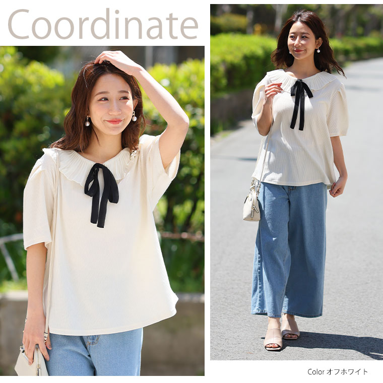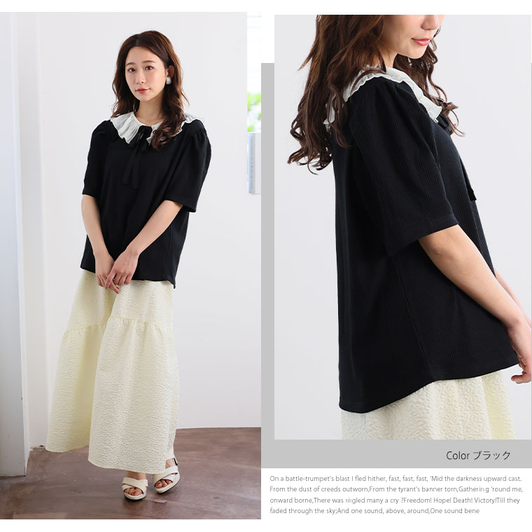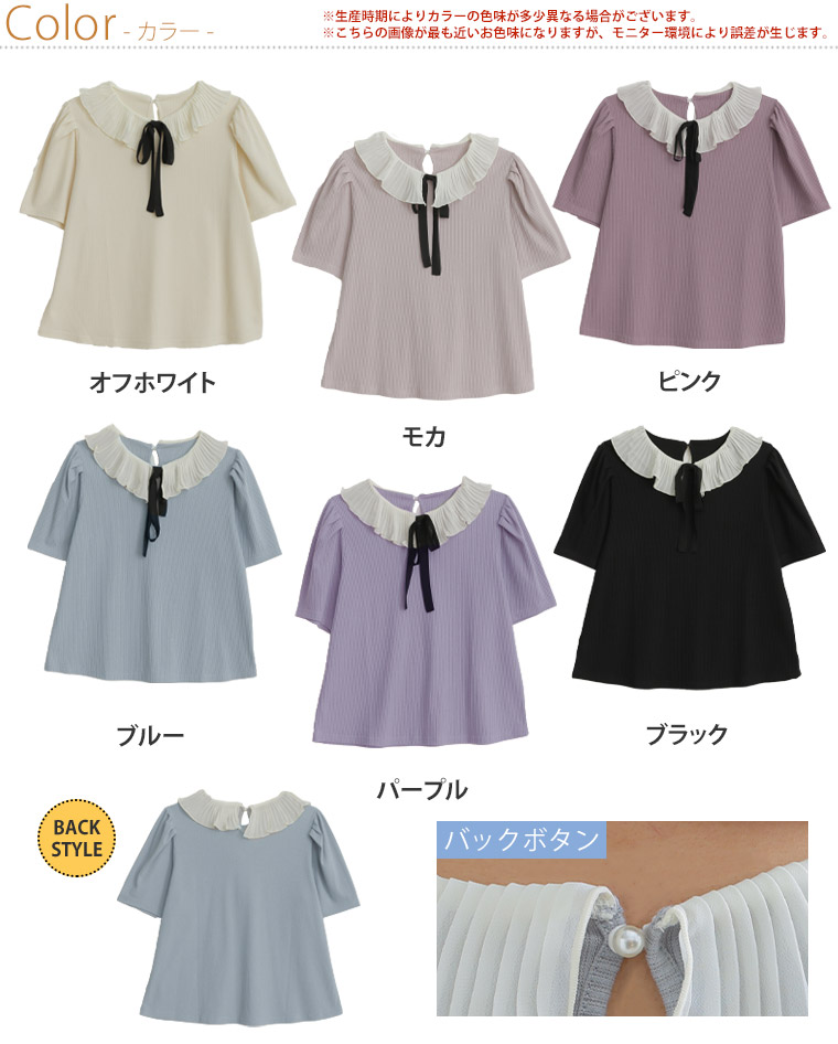 着心地リラックス快適リブ素材 フェミニンフリル襟トップス