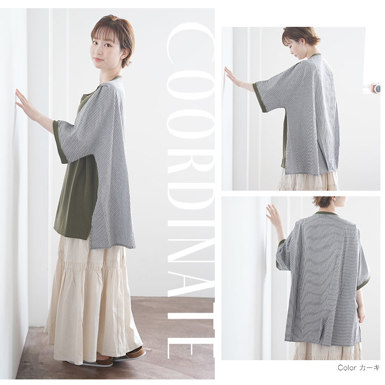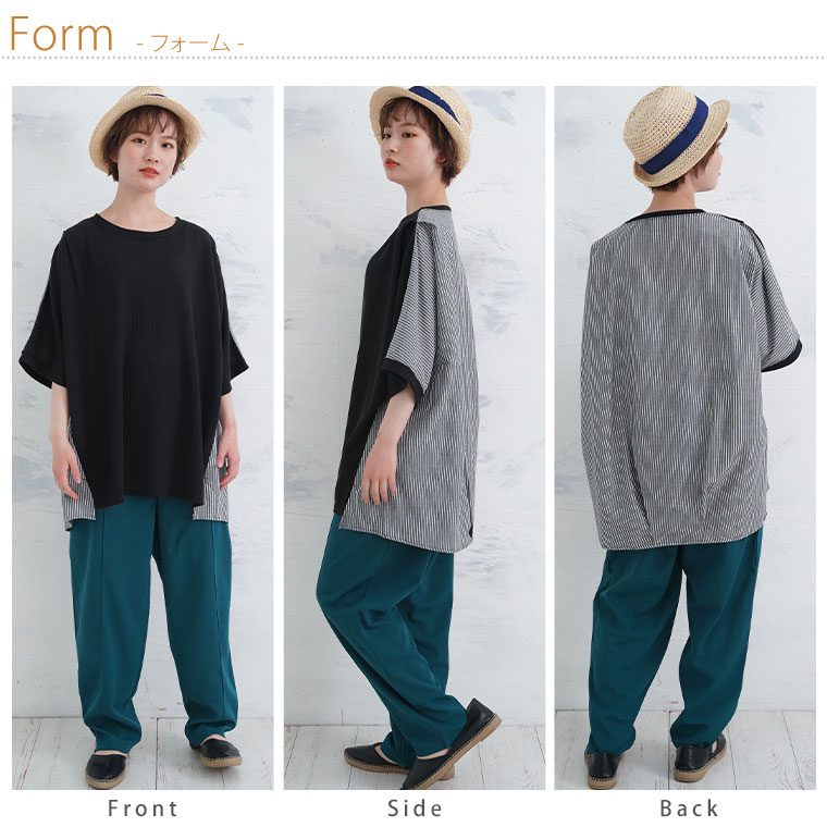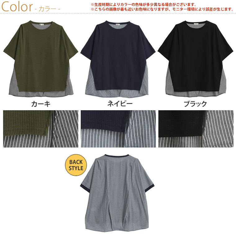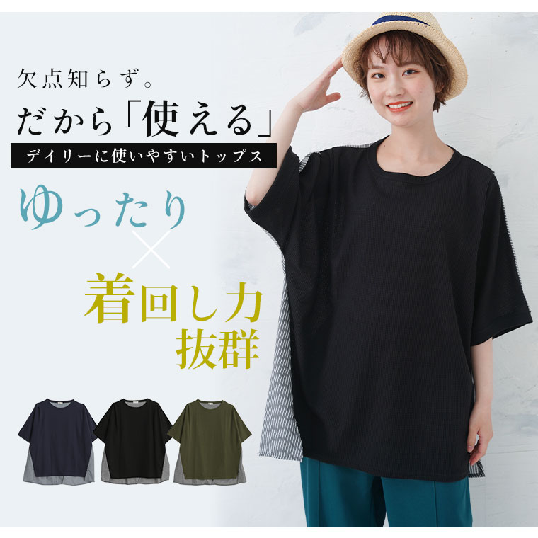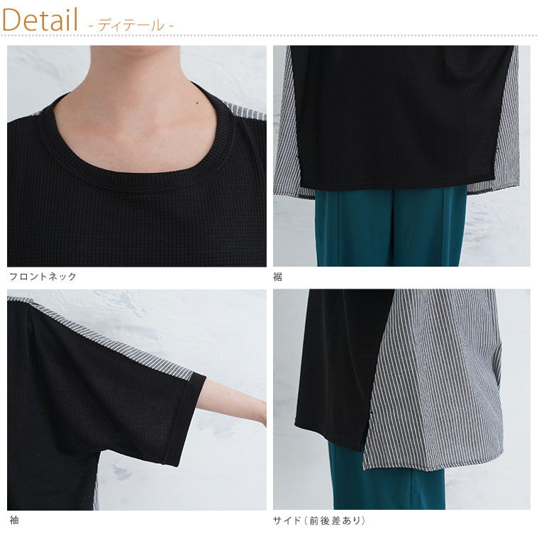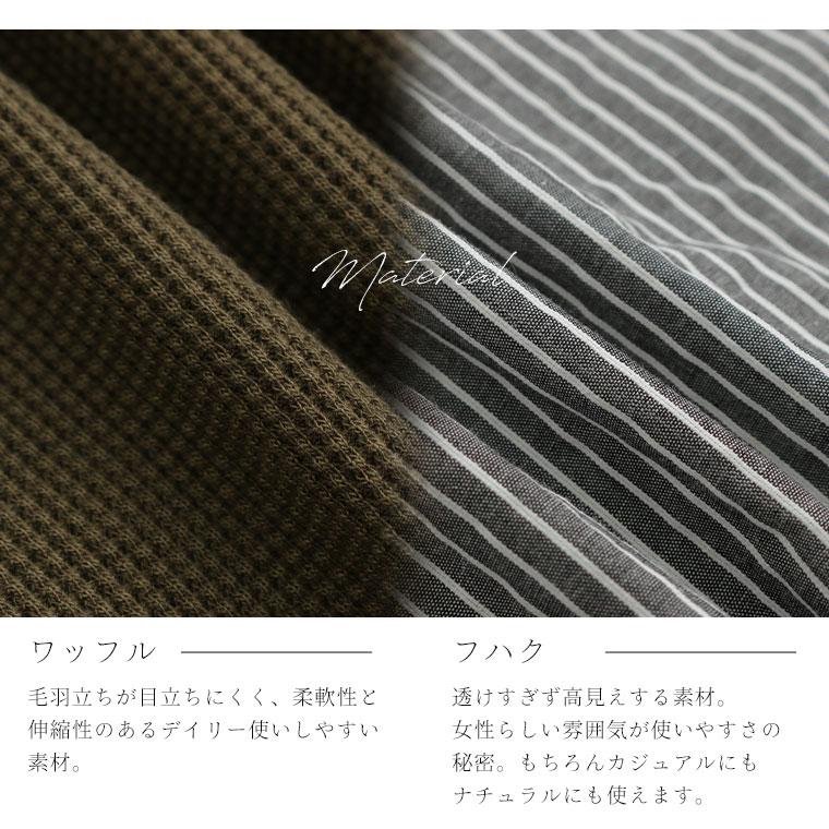 バックストライプ×ワッフル 切り替え異素材MIXトップス