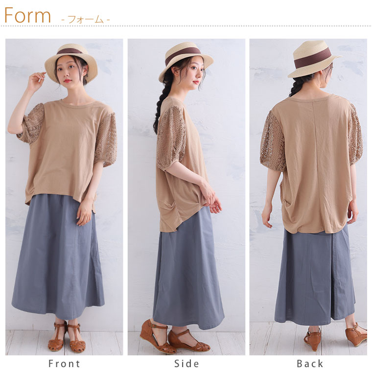 ■着用感:ぴったり、■着丈:お尻すっぽり、■バスト:ゆったり、■腕回り:ゆったり、■袖口:小さめ、■袖丈:肘上、■首回り:ゆったり、●ほんのり肌見せしつつ二の腕は隠れるからいい感じ