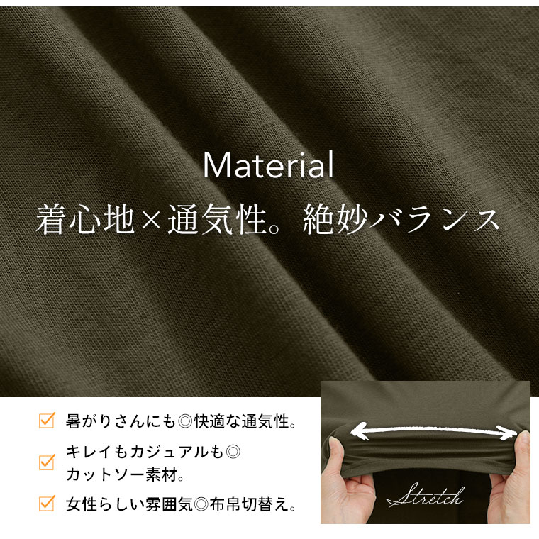 スポリと着やすく後ろの切り替え部の綿生地がフワフワとして着心地軽いです。胸のサイズを考慮しお勧めより大きいサイズだからか鏡を見て大きいかな?と思ったりもするが、合わせるボトムでバランスをとろうと思います。