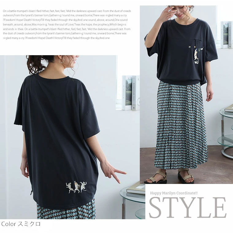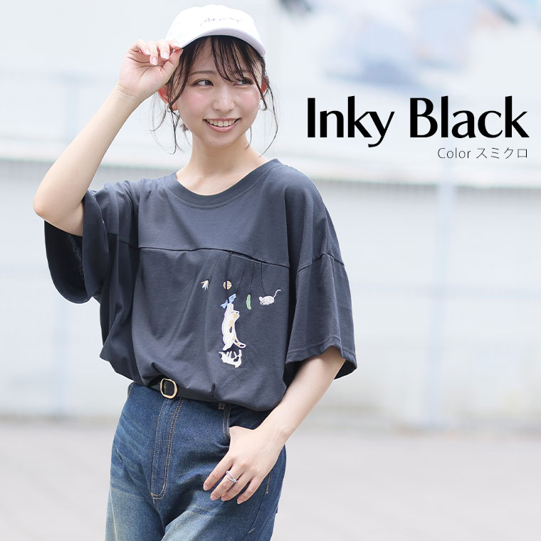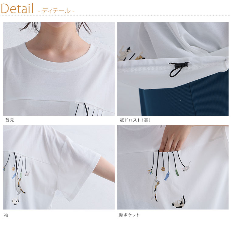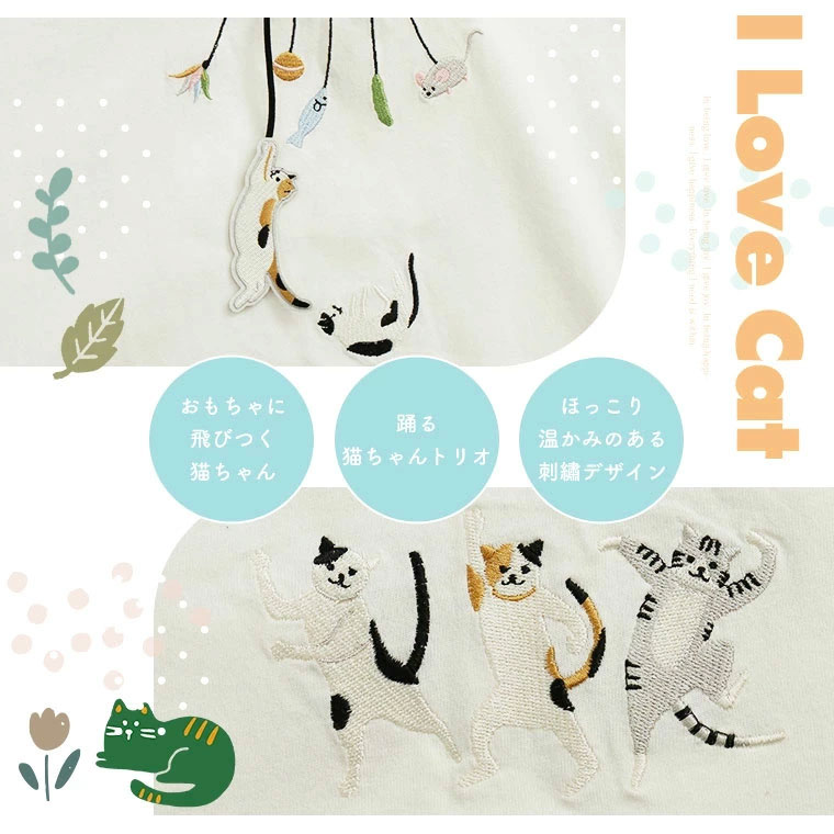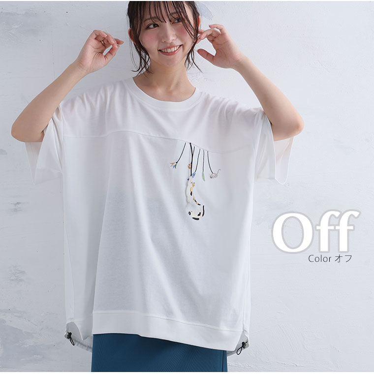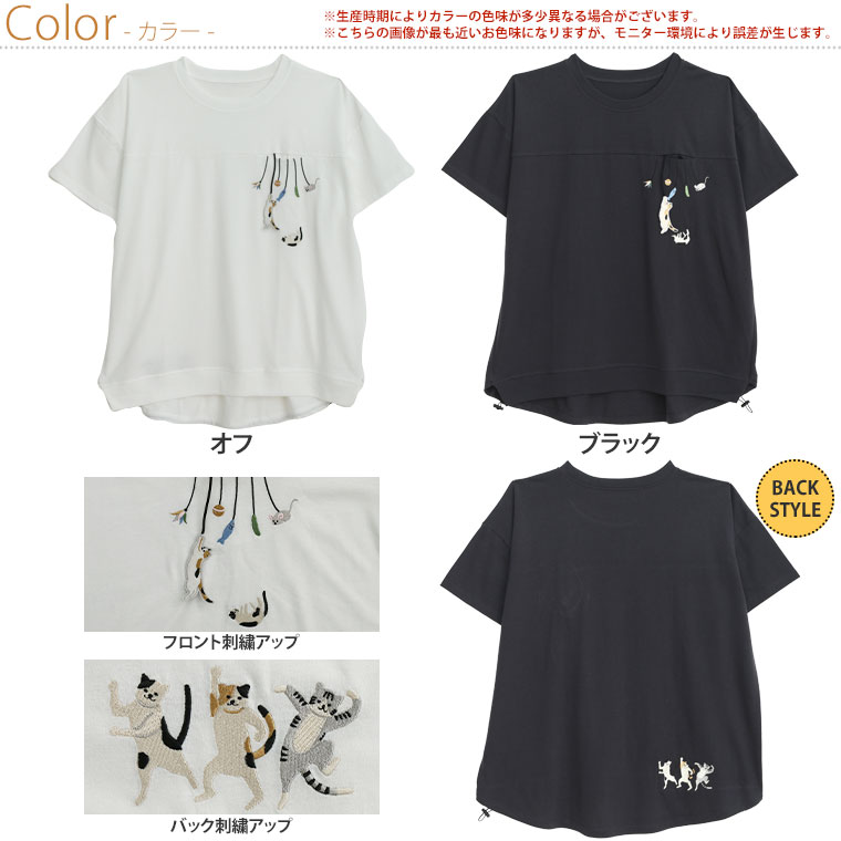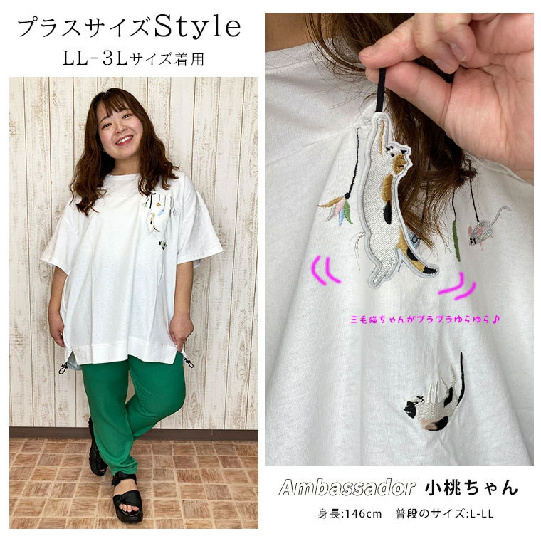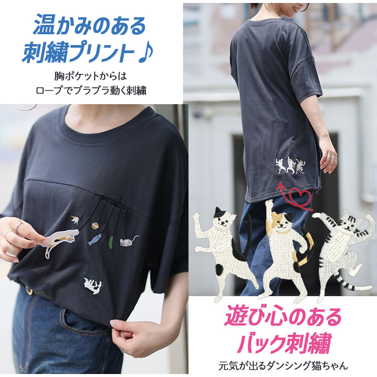 大きいサイズ ぶらぶら 猫刺繍 Tシャツ