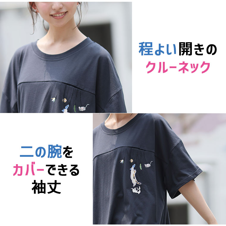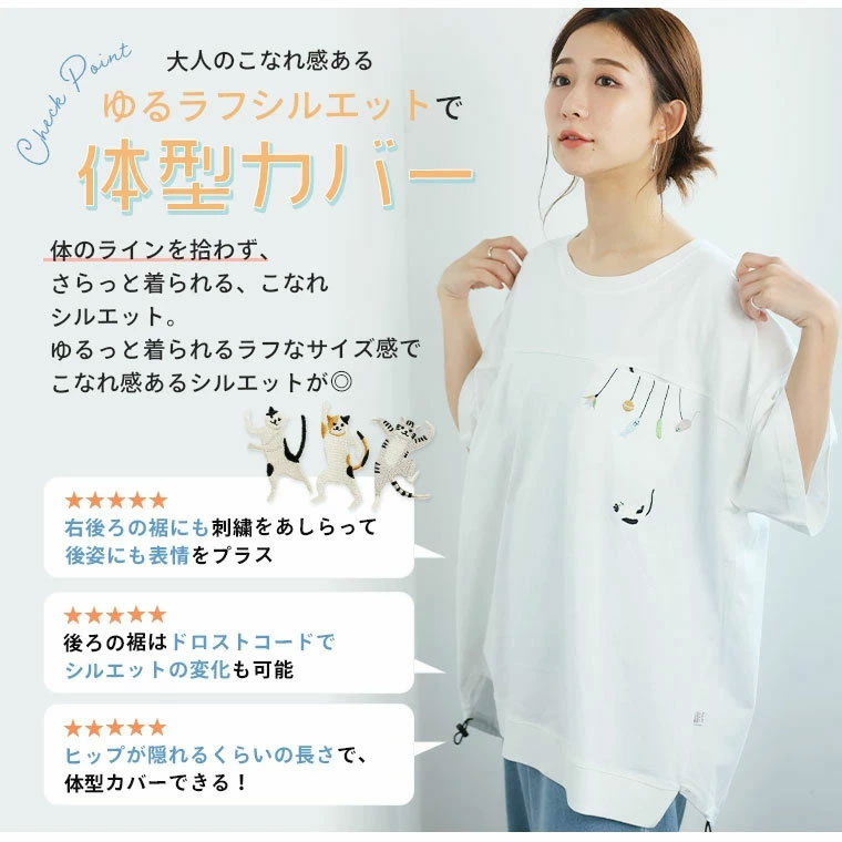 カットソー LL 3L 4L 5L 半袖 夏 夏物 夏服 夏用 ぽっちゃり ゆったり プラスサイズ アニマルTシャツ キャットTシャツ かわいい おしゃれ カジュアル ナチュラル お尻 二の腕カバー ぶらぶら 猫刺繍 Tシャツ