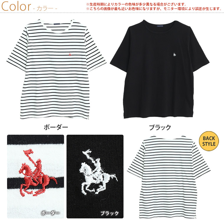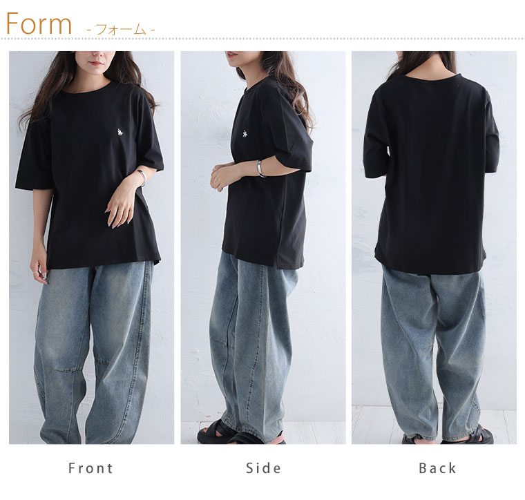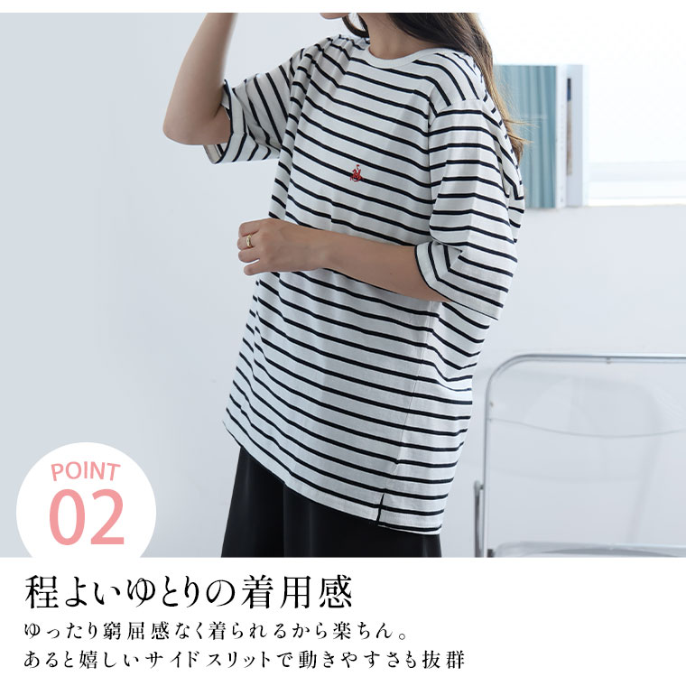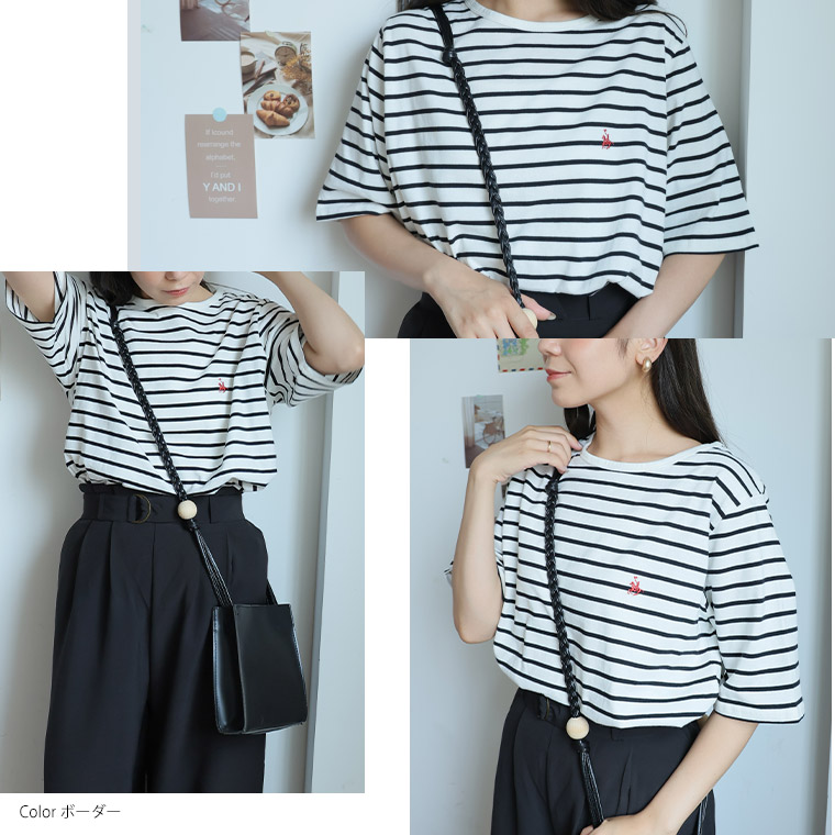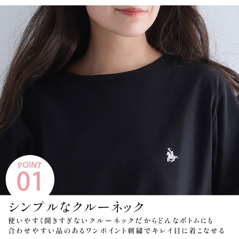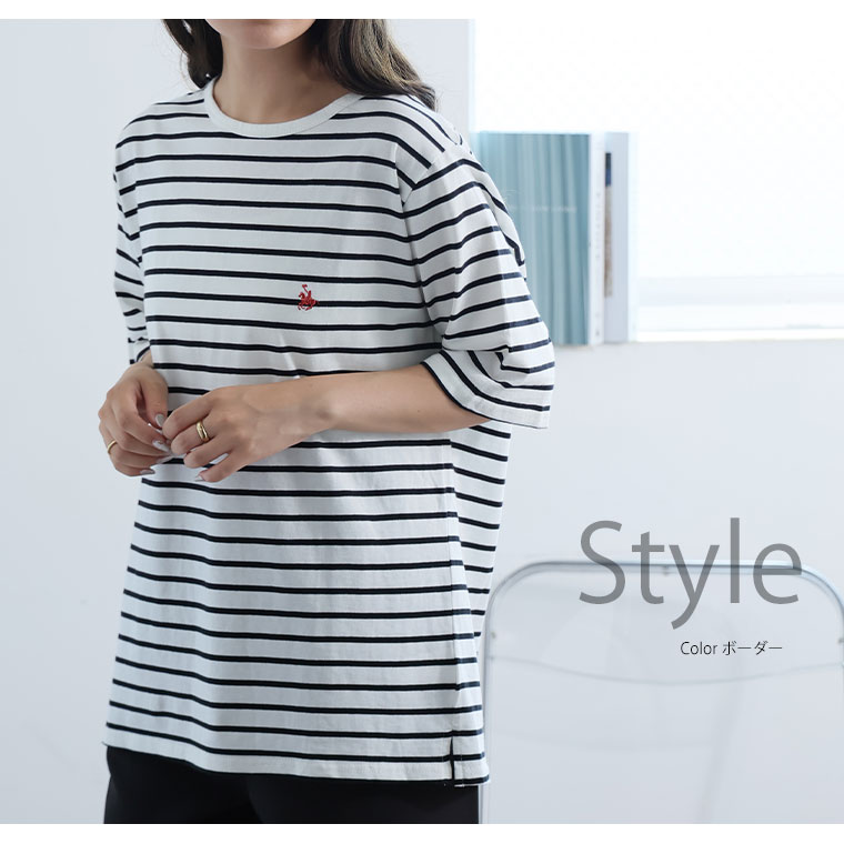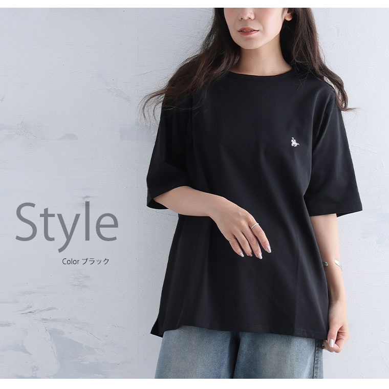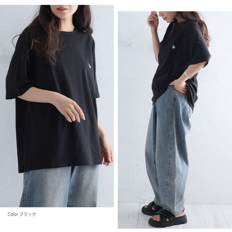 シンプルなコットンTシャツに胸のワンポイント刺繍がアクセント