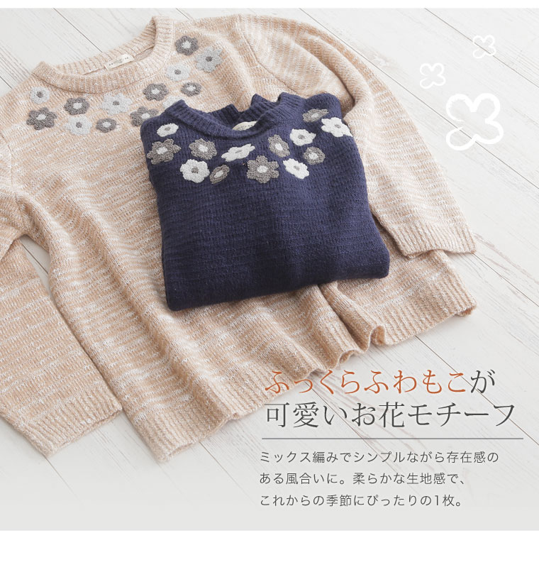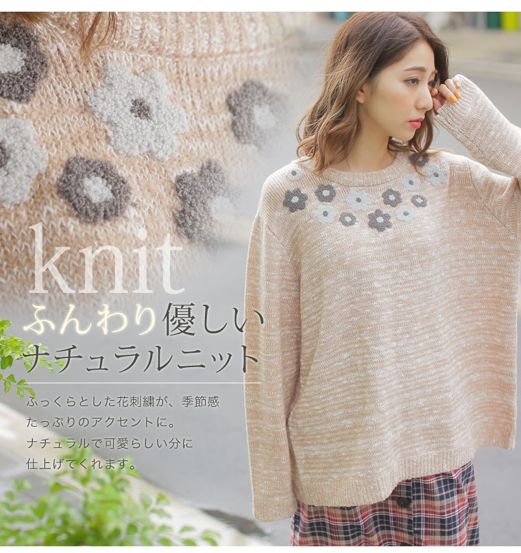ふっくらしたミドルゲージに立体的な刺繍を添えたニットトップス