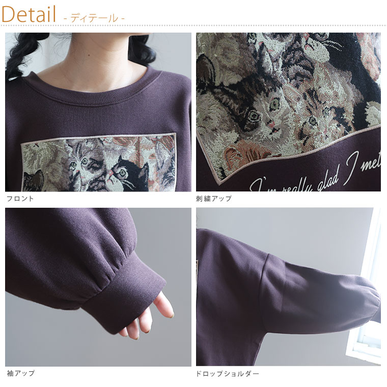 5. 大きいサイズ ネコ柄 ゴブラン アップリケ あったか 裏起毛 スウェット