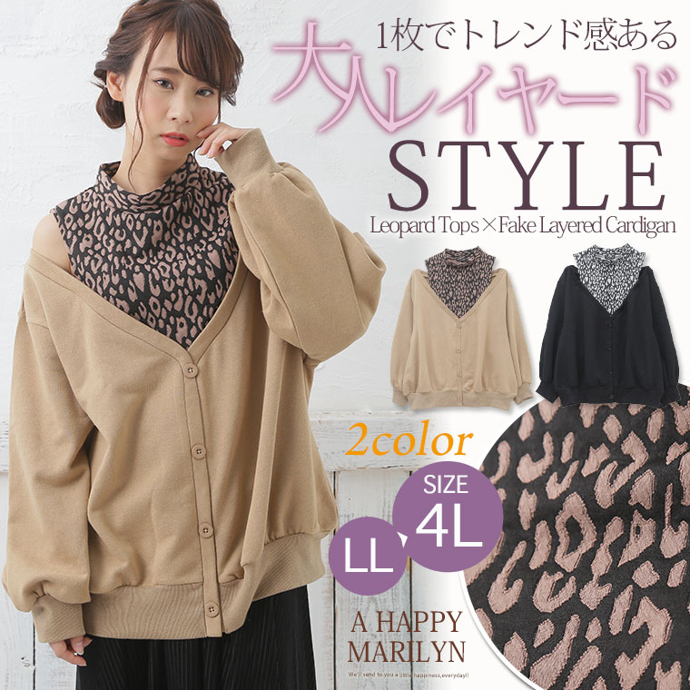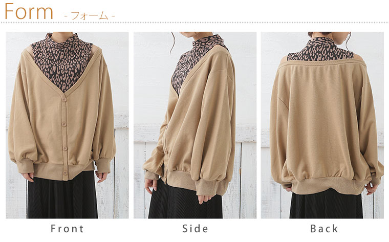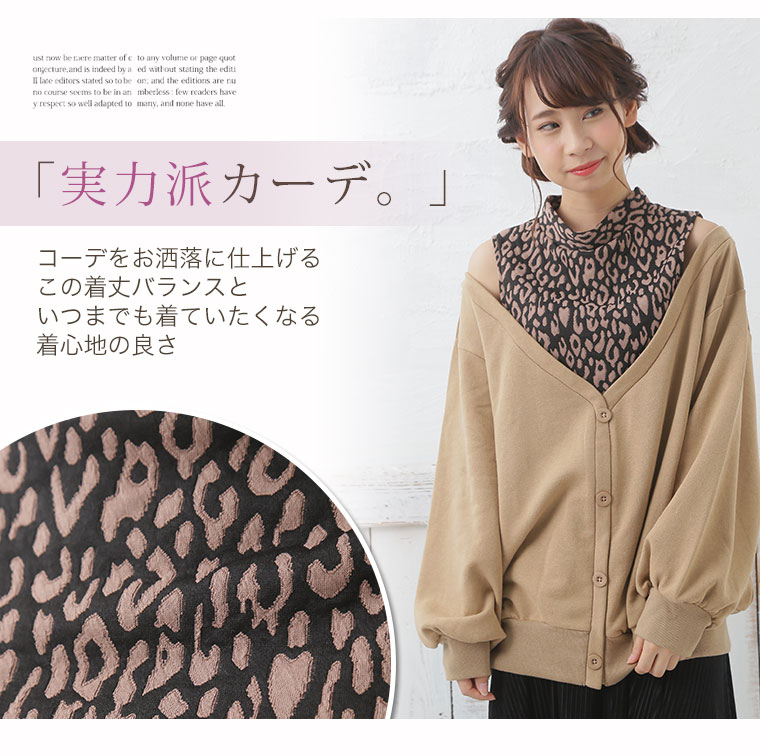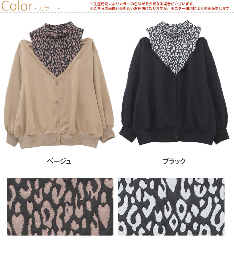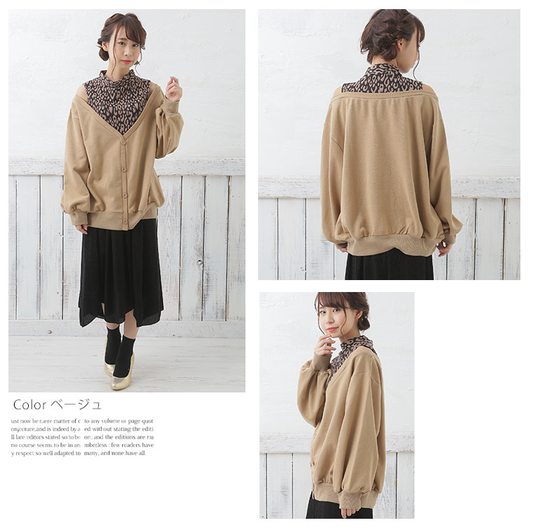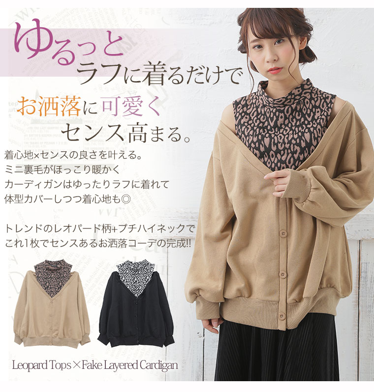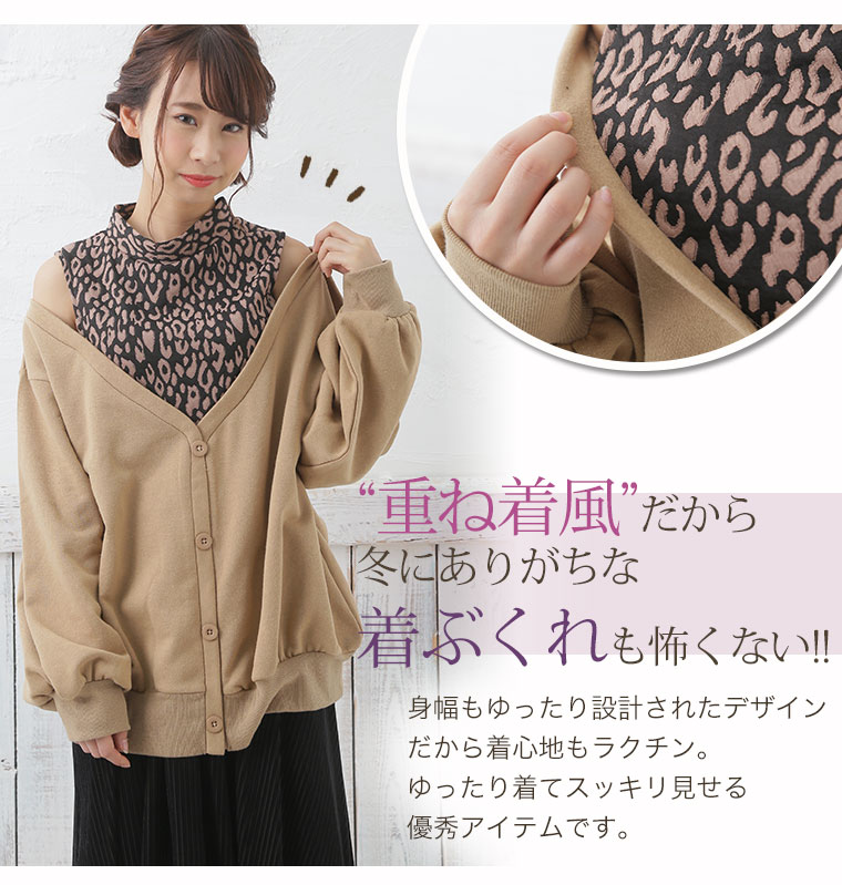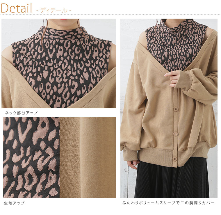 レオパード柄プチハイ×Vネックカーデのフェイクレイヤードミニ裏毛プルオーバー