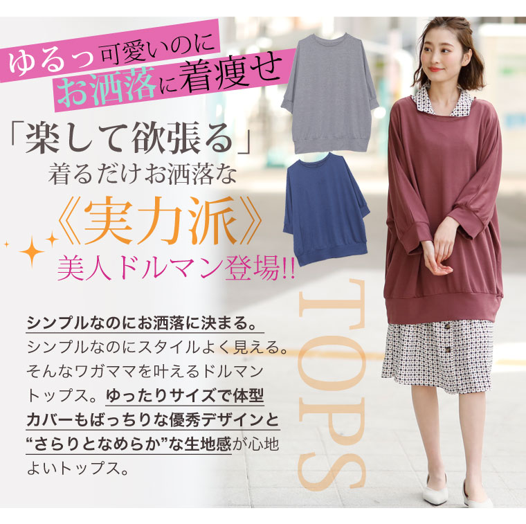 3. 大きいサイズ さらりと心地よい 細魅せ ドルマン 長袖 ニットソー トップス