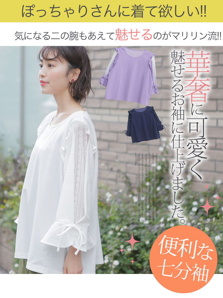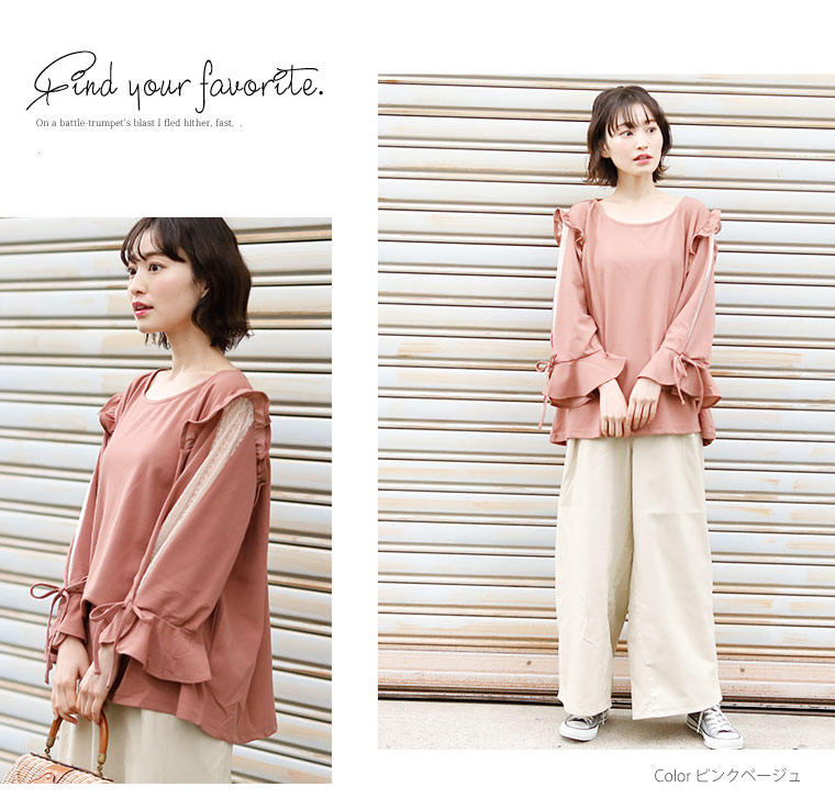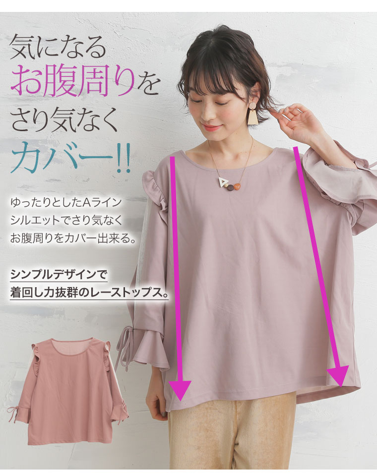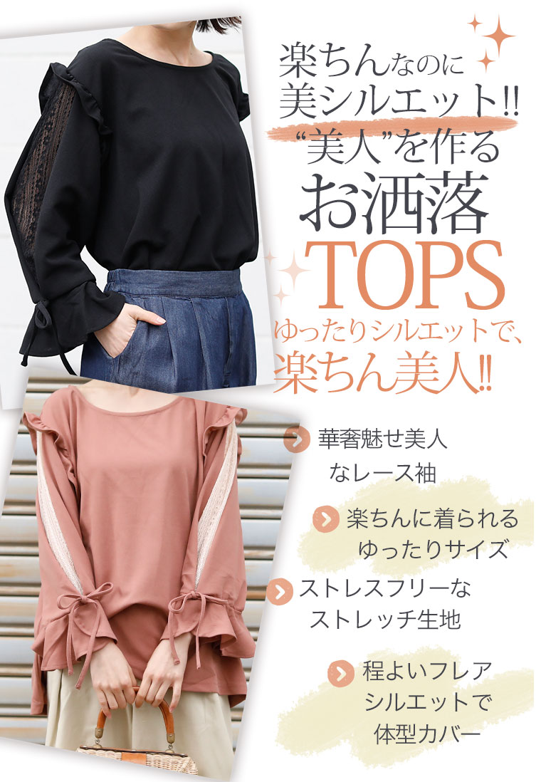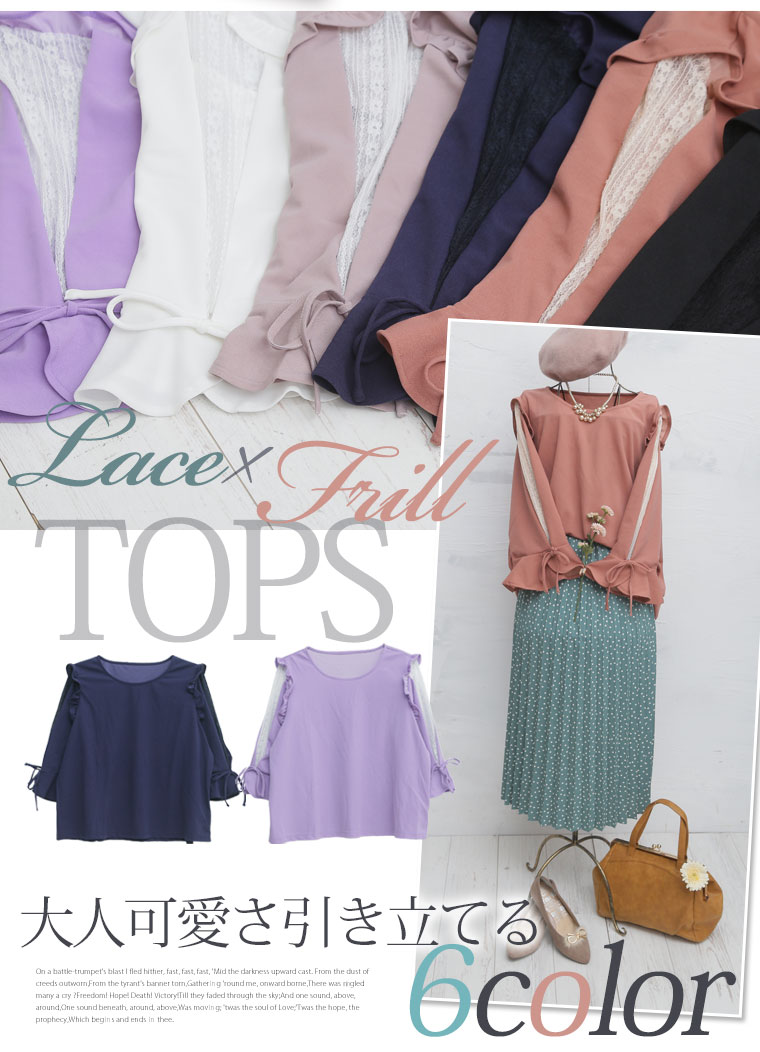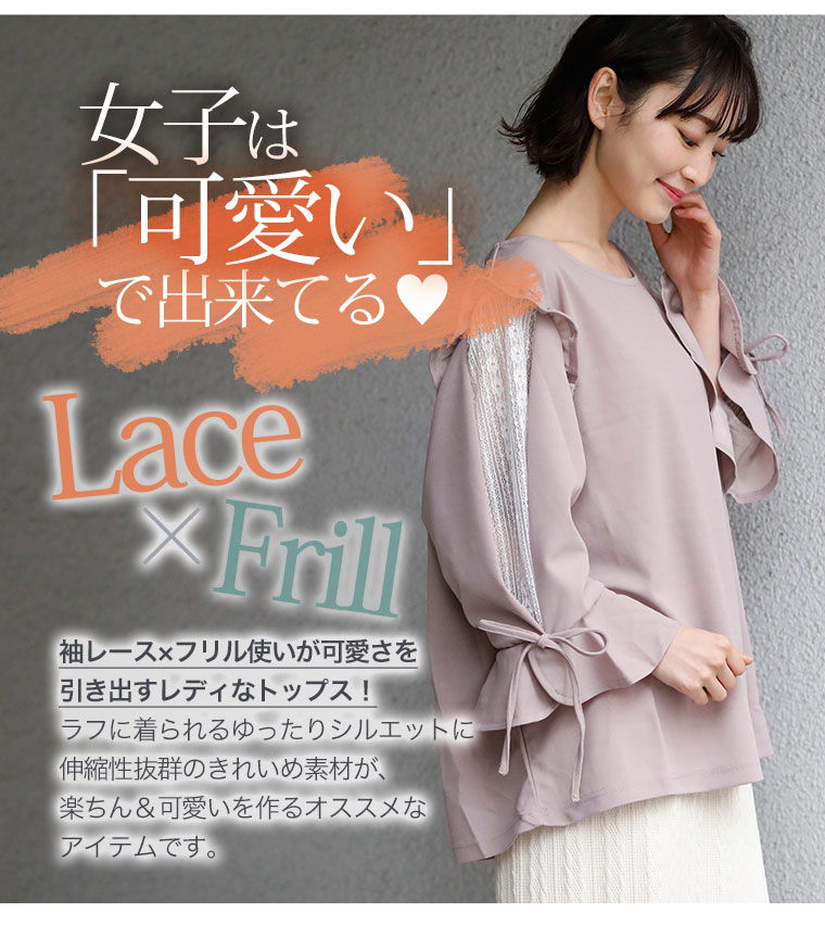 ちらりと覗く袖レースがアクセント!!ひらりと揺れるフリル袖トップス
